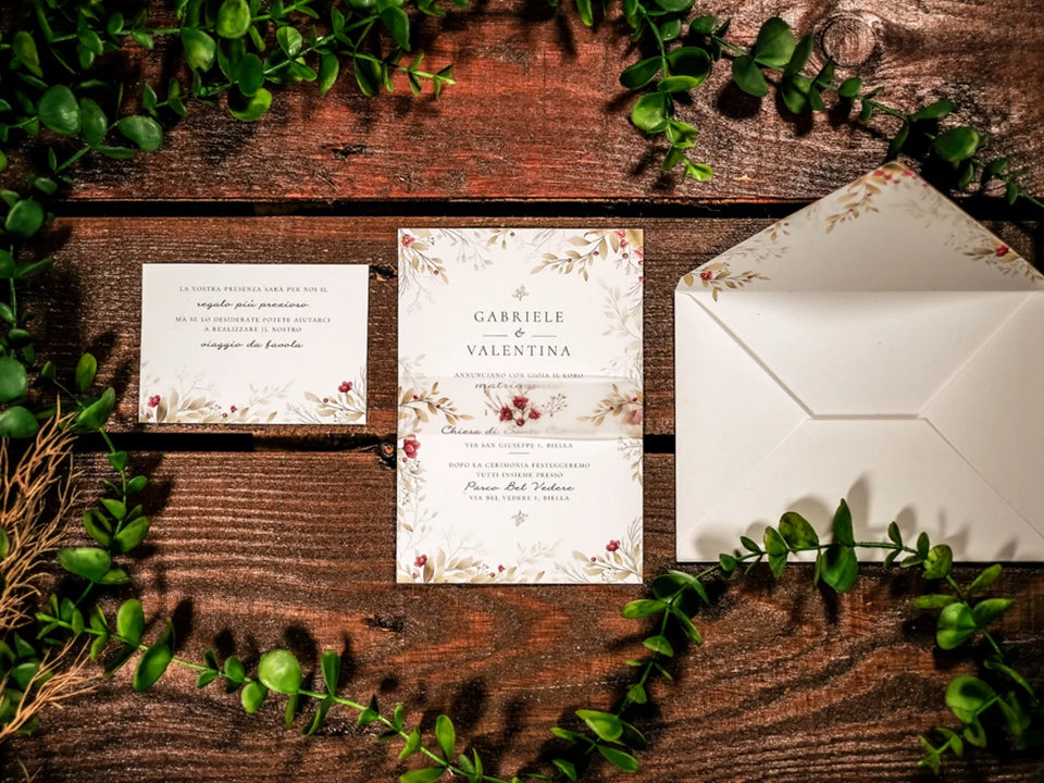 Un’altra tendenza apprezzata è quella delle partecipazioni tematiche, che si integrano perfettamente con lo stile del matrimonio. Possono essere arricchite da grafiche personalizzate, motivi simbolici o palette colori coerenti con l’intero evento.