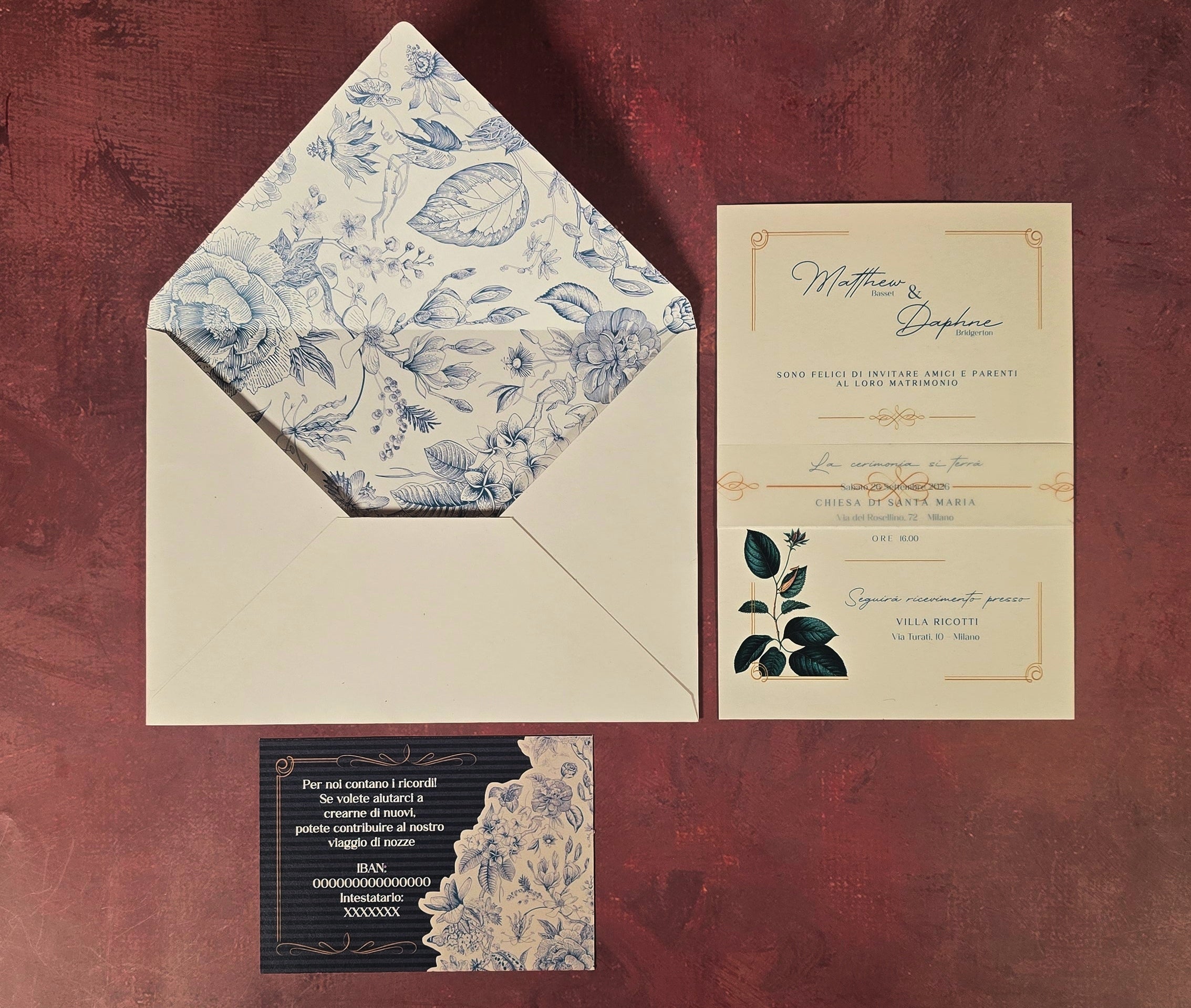 linea basic 46 - Partecipazione di ispirazione Regency che incarna l'eleganza senza tempo di uno stile classico e raffinato. La grafica romantica si ispira alle atmosfere d'epoca, impreziosita da una palette di colori sofisticata: l'azzurro avio si combina armoniosamente con il rosa antico, ravvivato da delicati dettagli in ocra che aggiungono un tocco di calore.