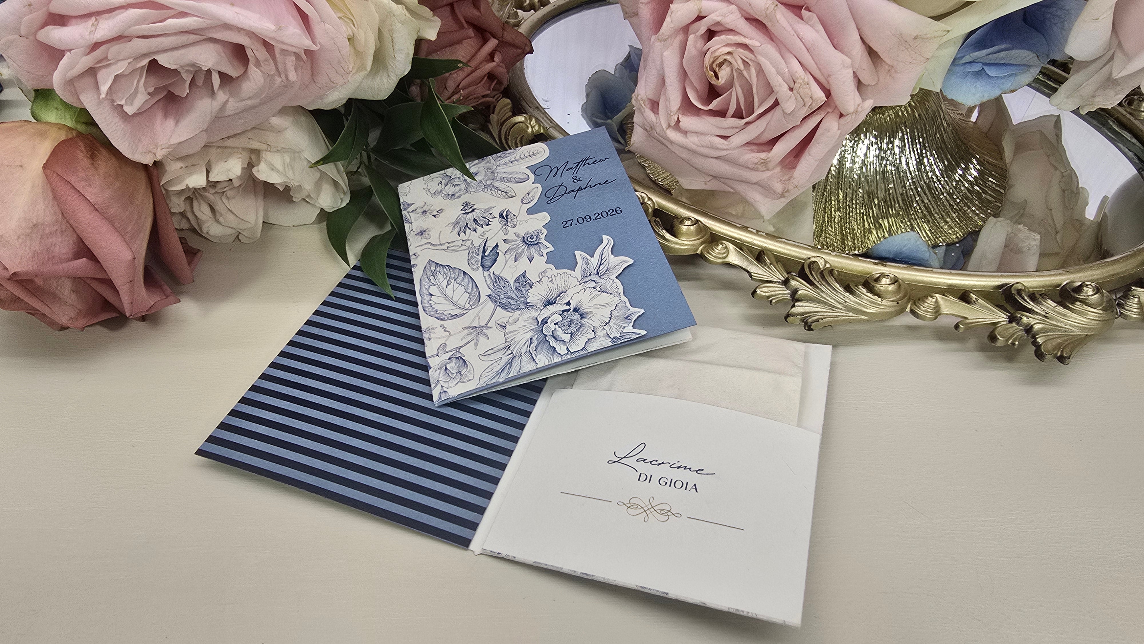 Blister in stile Regency contenente speciali fazzolettini per le "lacrime di gioia". Elegante e raffinato, è ideale come pensiero singolo o da inserire in una wedding box. Il blister (chiuso 6 x 12 cm) presenta una delicata stampa floreale con intagli e una pratica tasca interna che custodisce i fazzolettini. Completamente personalizzabile sul frontale in cartoncino avorio con nomi, data o iniziali. Un dettaglio commovente e di classe per il vostro giorno speciale.