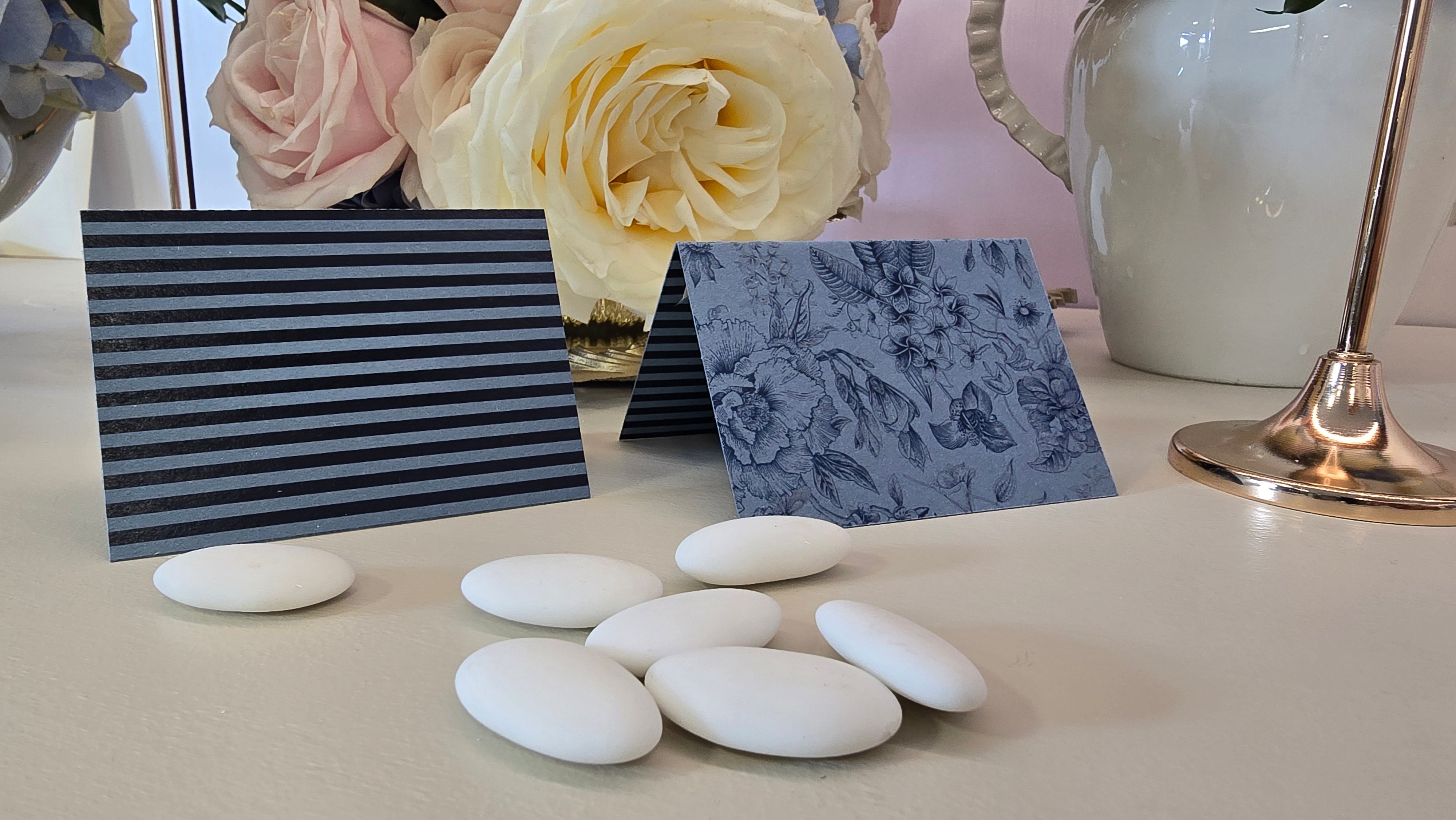 Cavalierini segnagusto "Regency " per confetti, caramelle e piccole delizie. Misura chiusi 9x6,5 cm (aperti 9x13 cm). La speciale stampa double face mostra su un lato un'elegante rigatura e sull'altro un motivo floreale, offrendo due diverse estetiche in un unico prodotto. Completano l'offerta due fessure per l'inserimento di un cartoncino interno.