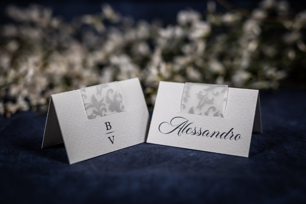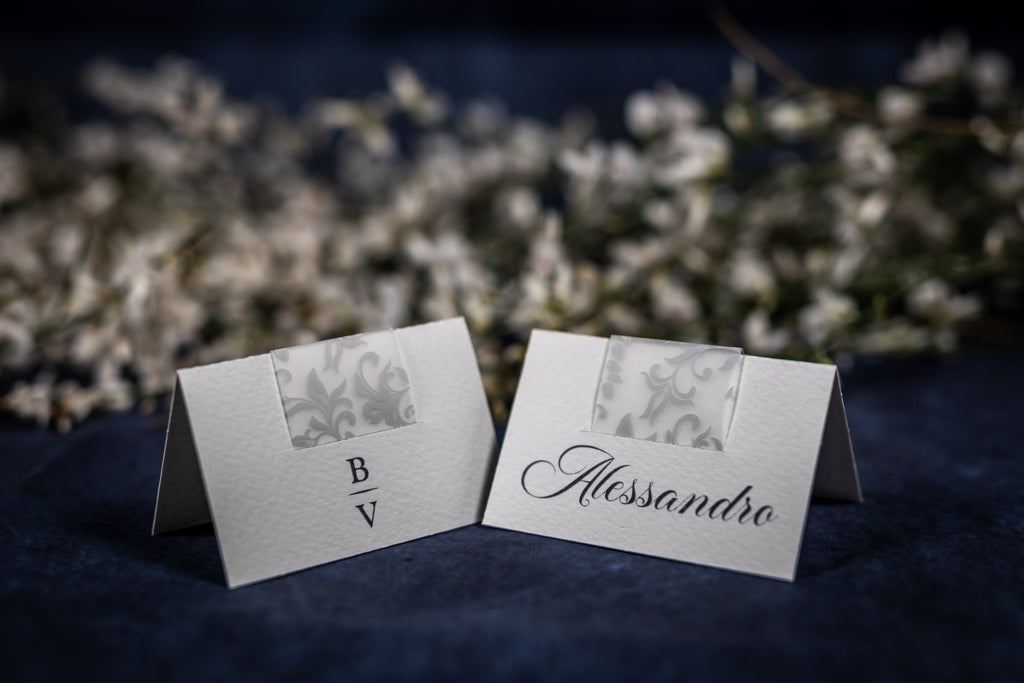 Realizzato su cartoncino martellato bianco da 240 grammi questo segnaposto è arricchito da un elegante inserto: una fascetta in carta opalina semitrasparente che riporta, con una stampa delicata, il decoro elegante caratteristico della linea WHISPER.