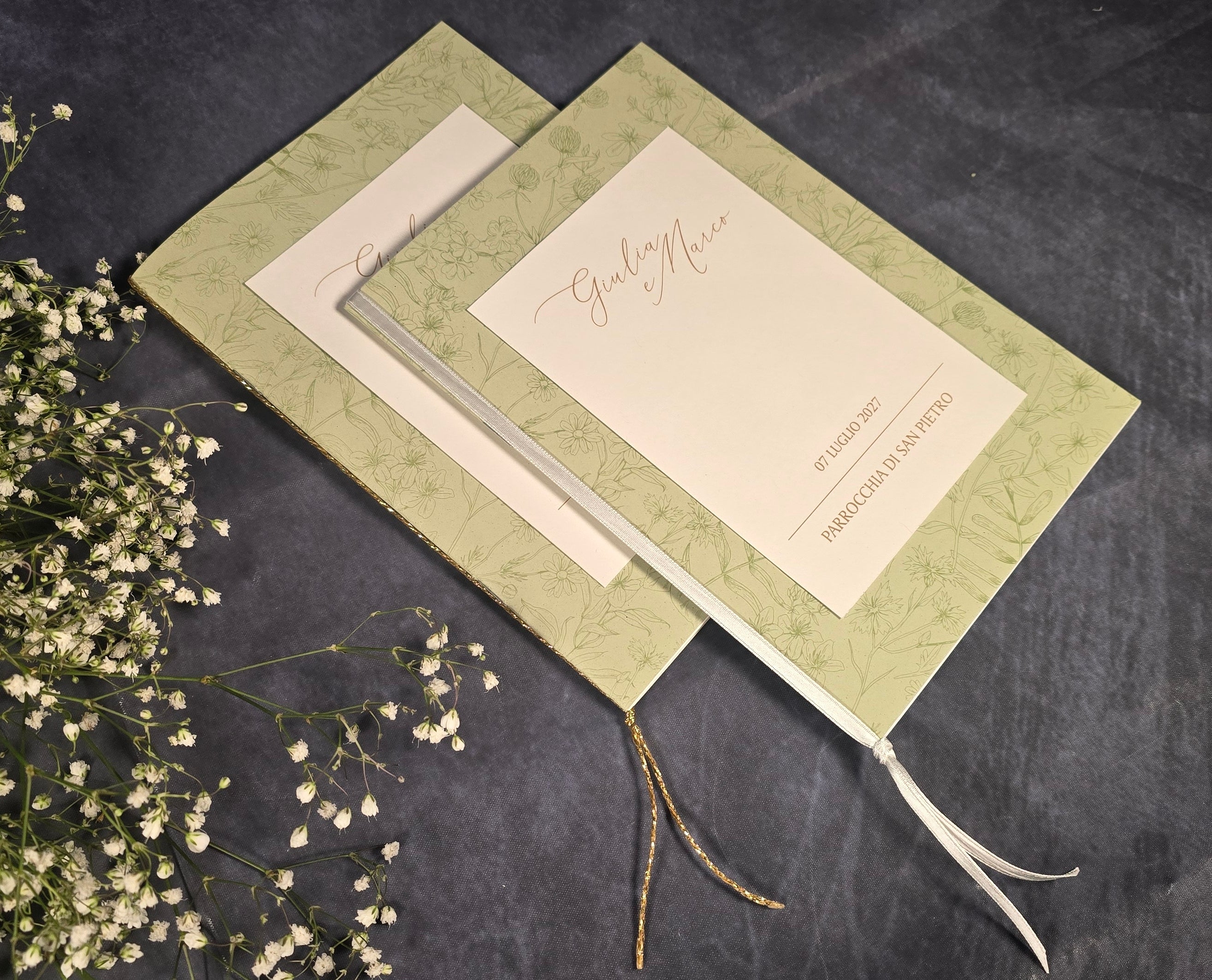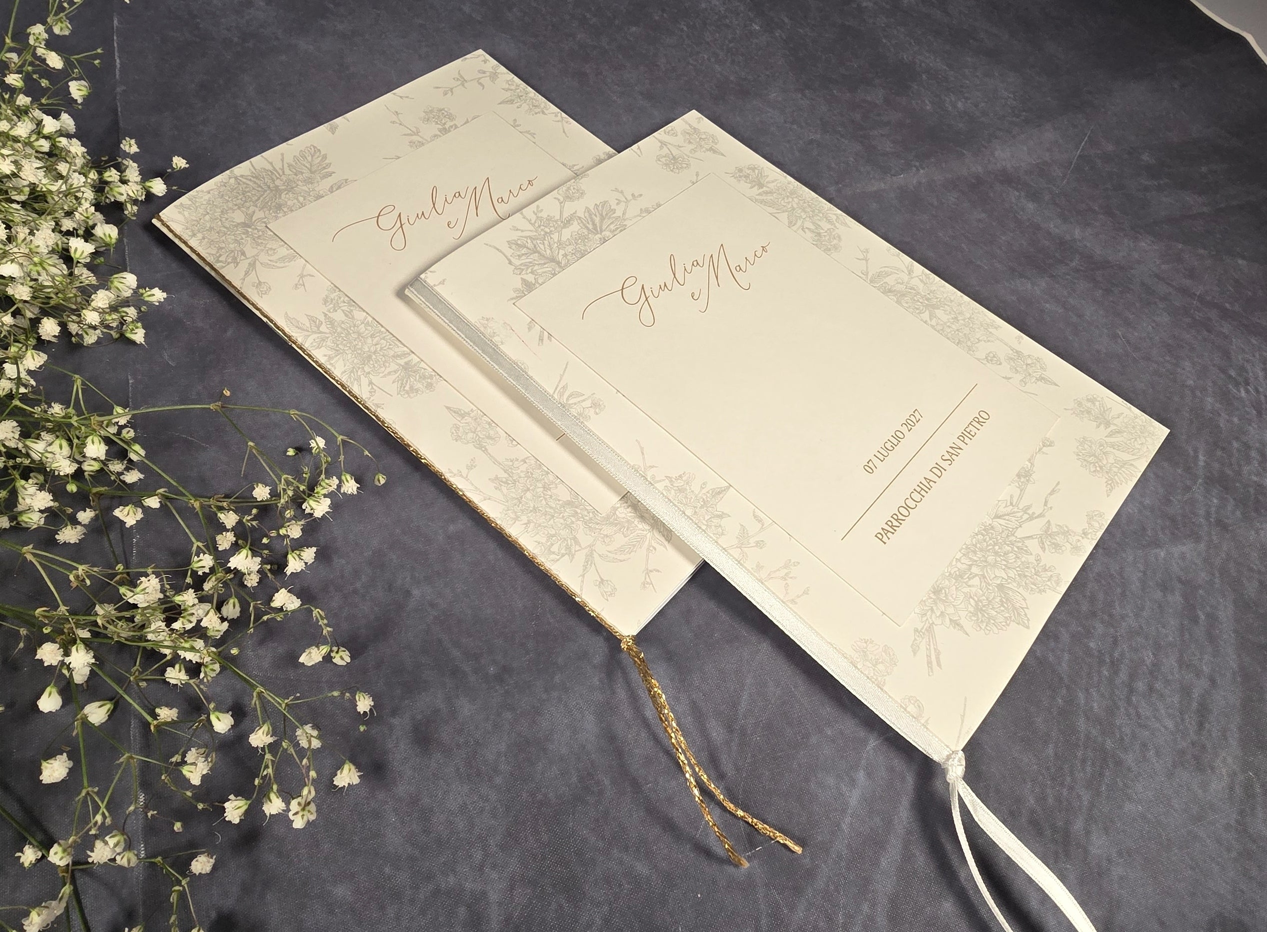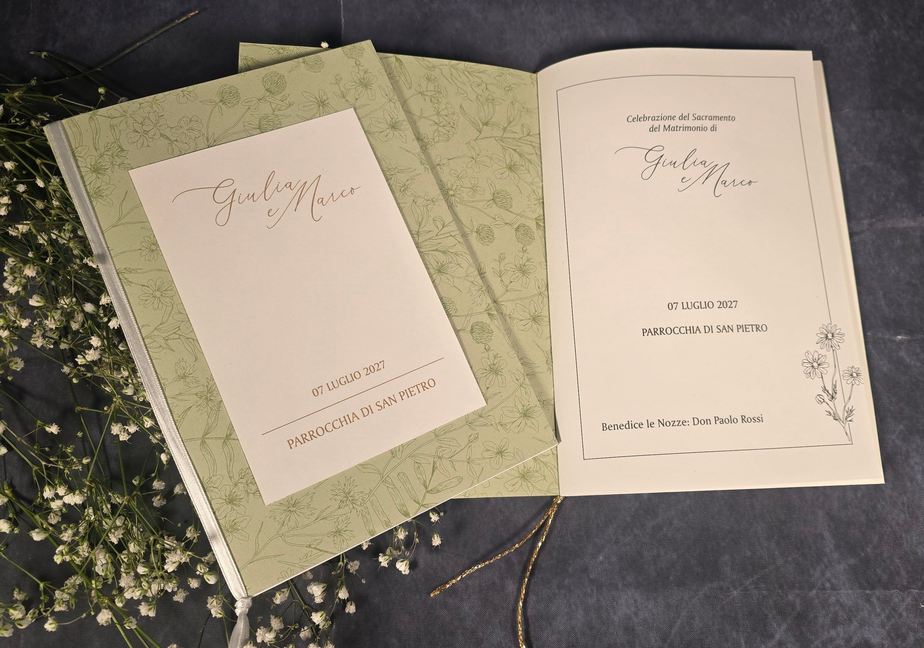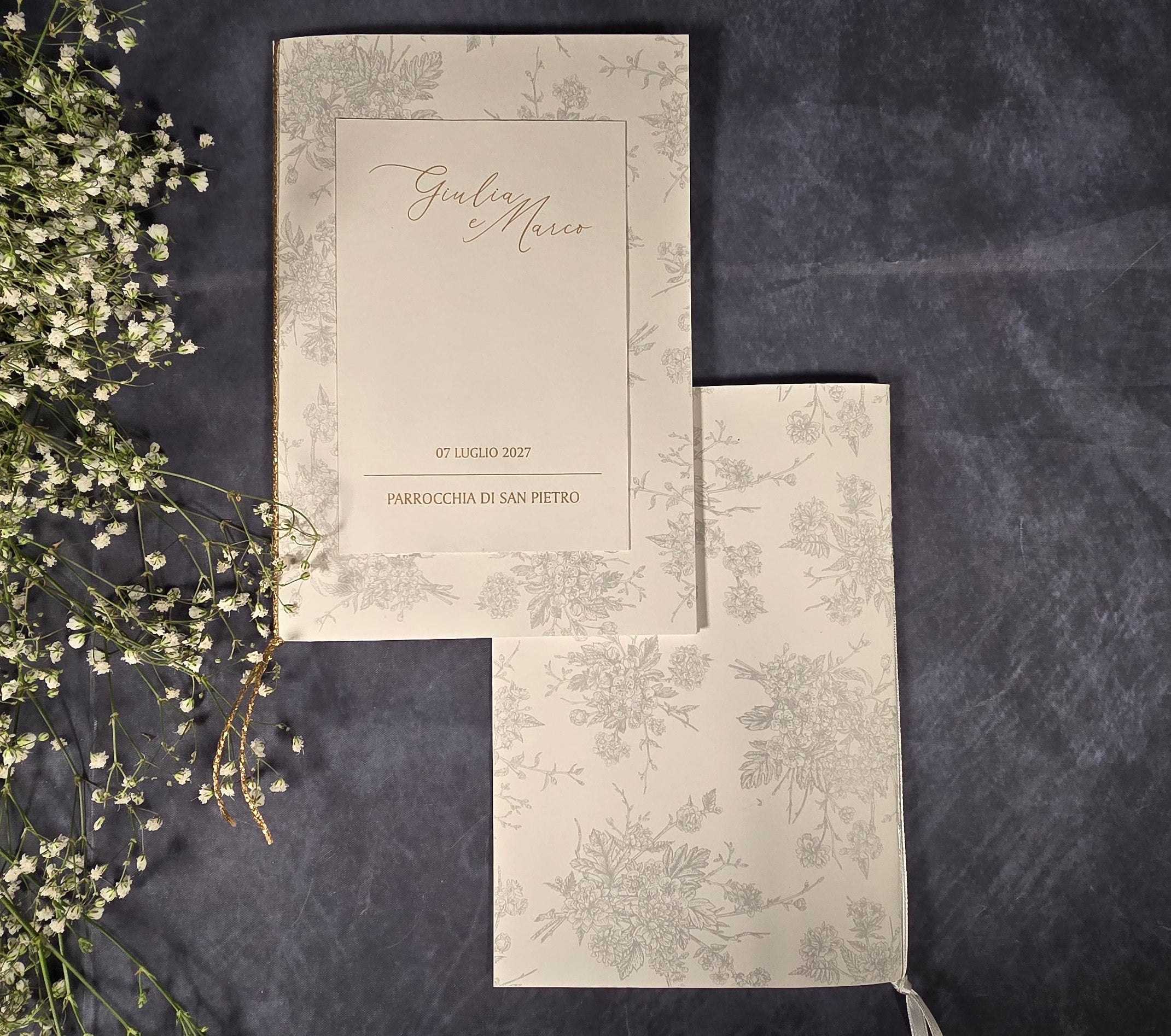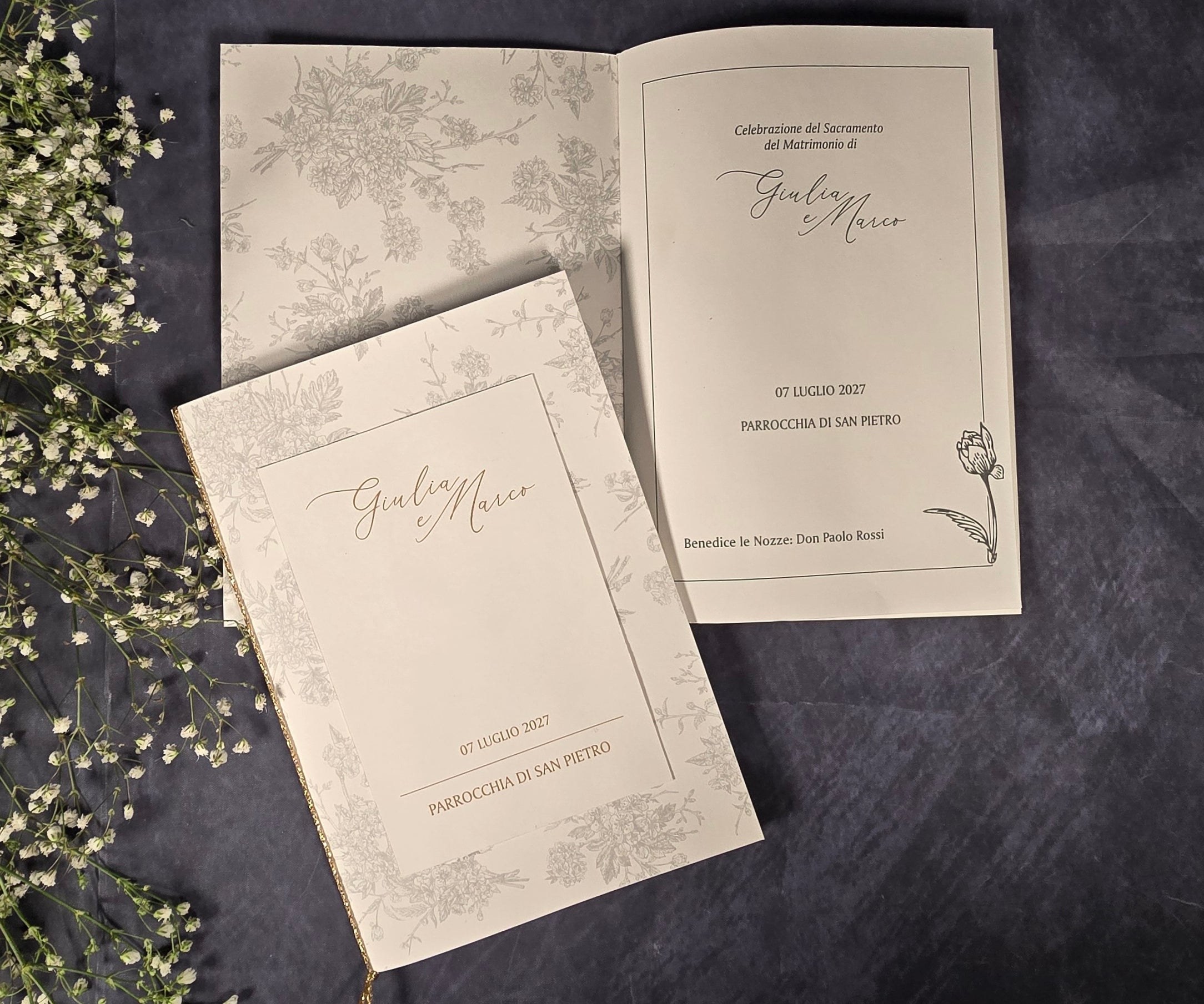 Ogni libretto è personalizzabile secondo i vostri desideri, garantendo un tocco unico e personalizzato per celebrare le vostre occasioni più importanti. Con copertine eleganti, design raffinati e materiali di alta qualità, i nostri libretti aggiungeranno un tocco di classe e significato spirituale alle vostre celebrazioni.