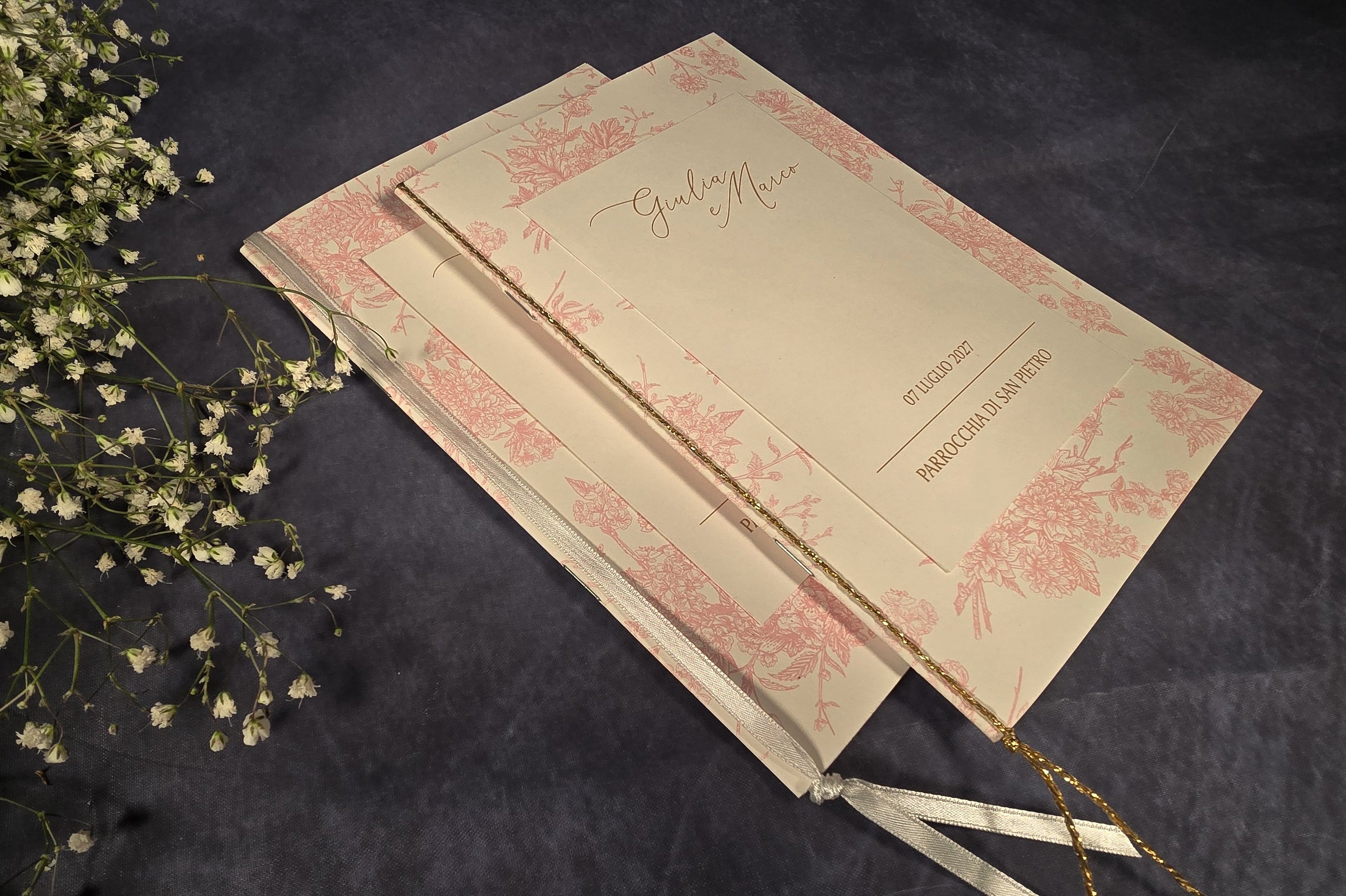 Realizzati per essere completati con la massima libertà, potrete scegliere la raffinata finitura con cordino dorato oppure con un elegante nastrino doppio in raso bianco. Disponibili in diversi formati, tutti caratterizzati dallo stesso elegante design floreale.