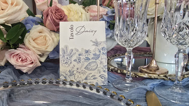 Segnatavolo in stile Regency, parte della stessa collezione grafica. Realizzato in doppio cartoncino intagliato con motivo floreale, presenta una scritta fronte e retro per una leggibilità perfetta da ogni angolazione.