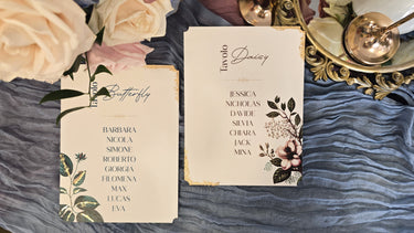 Cartoncini per Tableau de Mariage di misura 15x20 cm con angoli stondati. L'elemento distintivo è una preziosa lamina in foglia oro applicata manualmente. Proprio per la natura artigianale di questa lavorazione, ogni cartoncino presenta lievi e uniche variazioni che ne esaltano il carattere esclusivo. Disponibili in due versioni: stampati con il solo numero/nome del tavolo, oppure già completi con l'elenco nominativo degli ospiti assegnati.