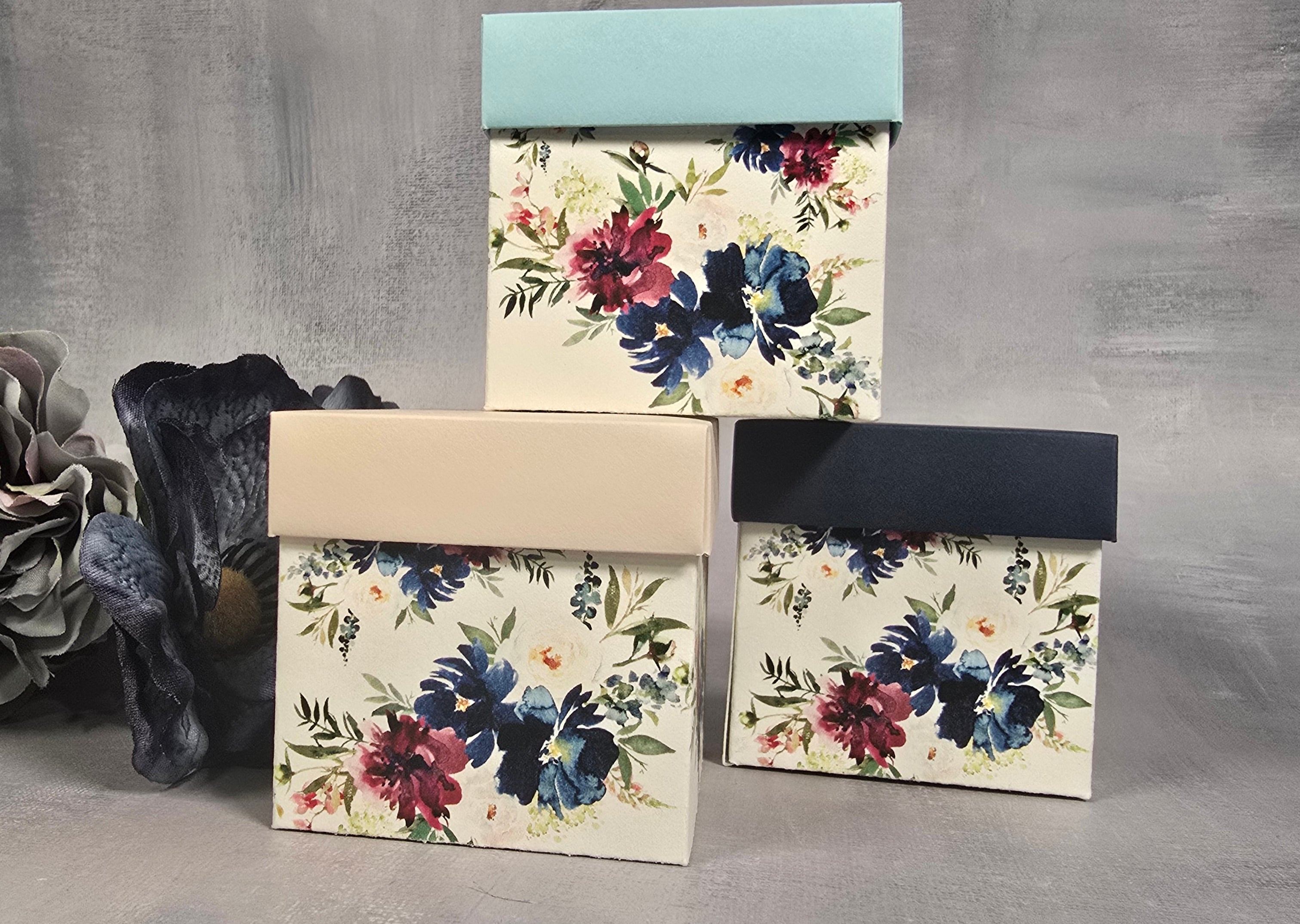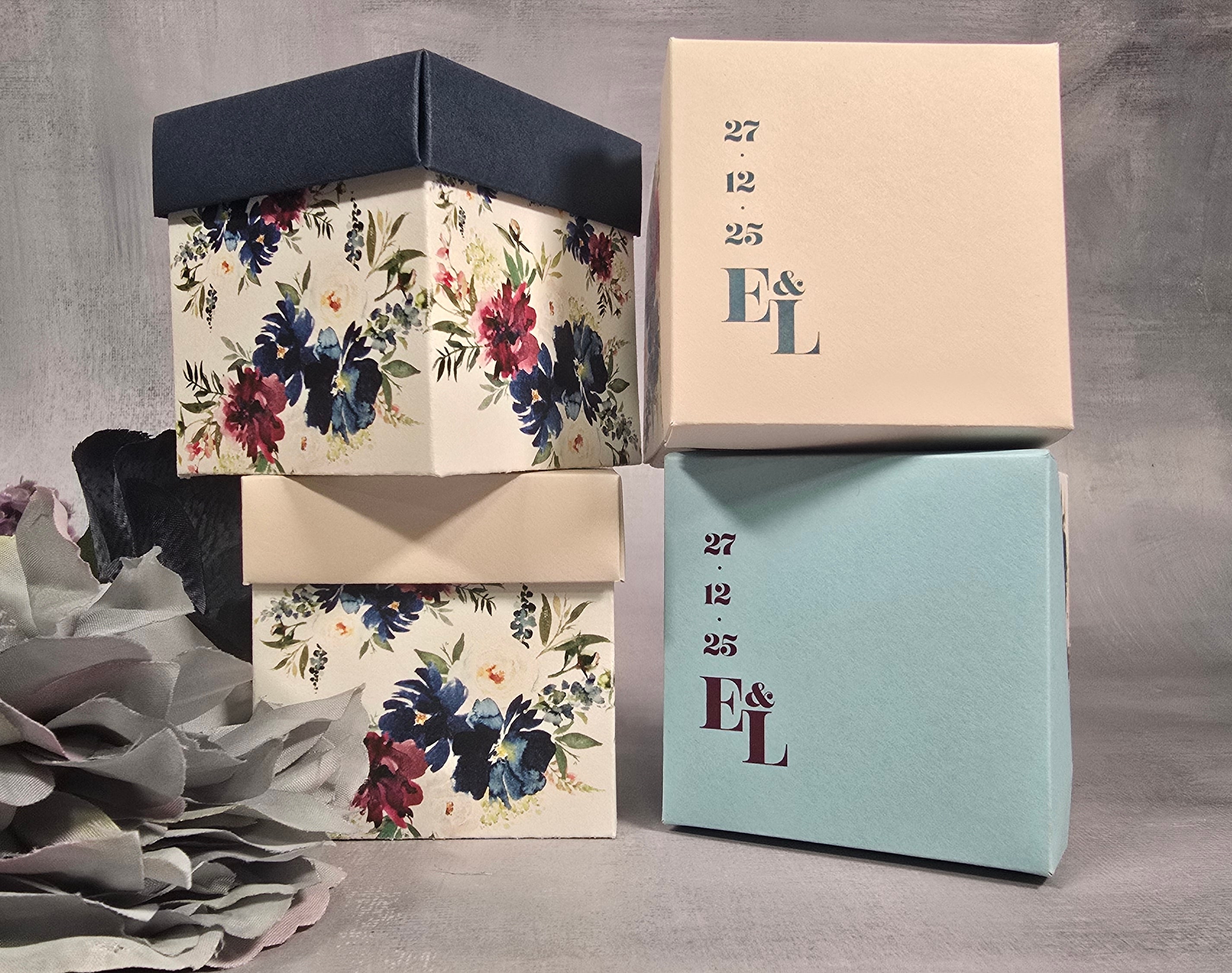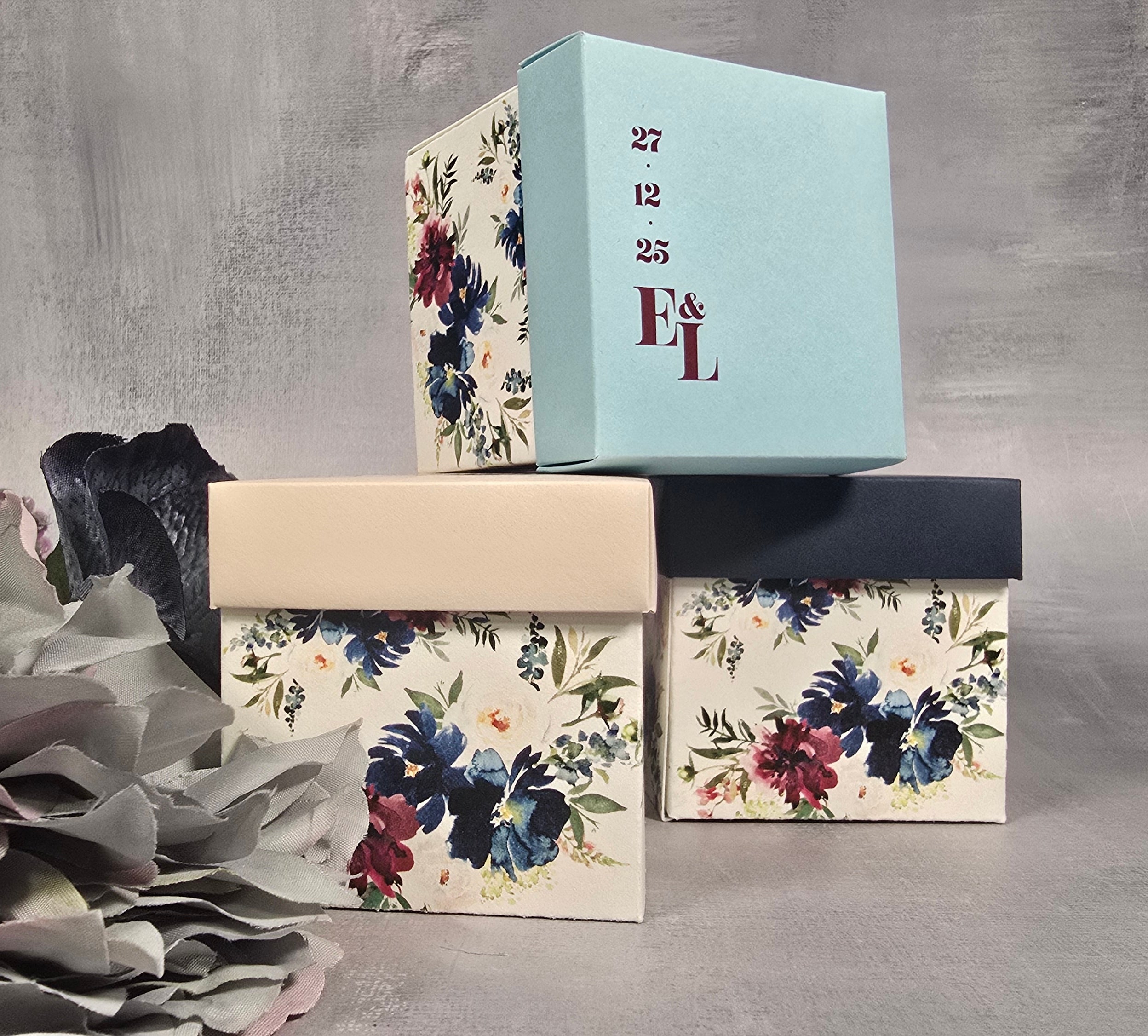 Scatolina Fiorata con Coperchio – 6x6x6 cm deale per rendere ancora più speciale la tua confettata o i regali per i tuoi ospiti! Questa graziosa scatolina, già montata e pronta da usare, è decorata con una stampa fiorata sulla base e si chiude con un coperchio disponibile in quattro colori diversi, perfetti per abbinarla alla tua linea e creare l’effetto che desideri. Puoi scegliere tra tre diversi layout di stampa per personalizzarla al massimo, e, se preferisci, puoi optare anche per il coperchio blu con scritta bianca, per un tocco di eleganza in più. Un modo semplice e raffinato per sorprendere i tuoi invitati