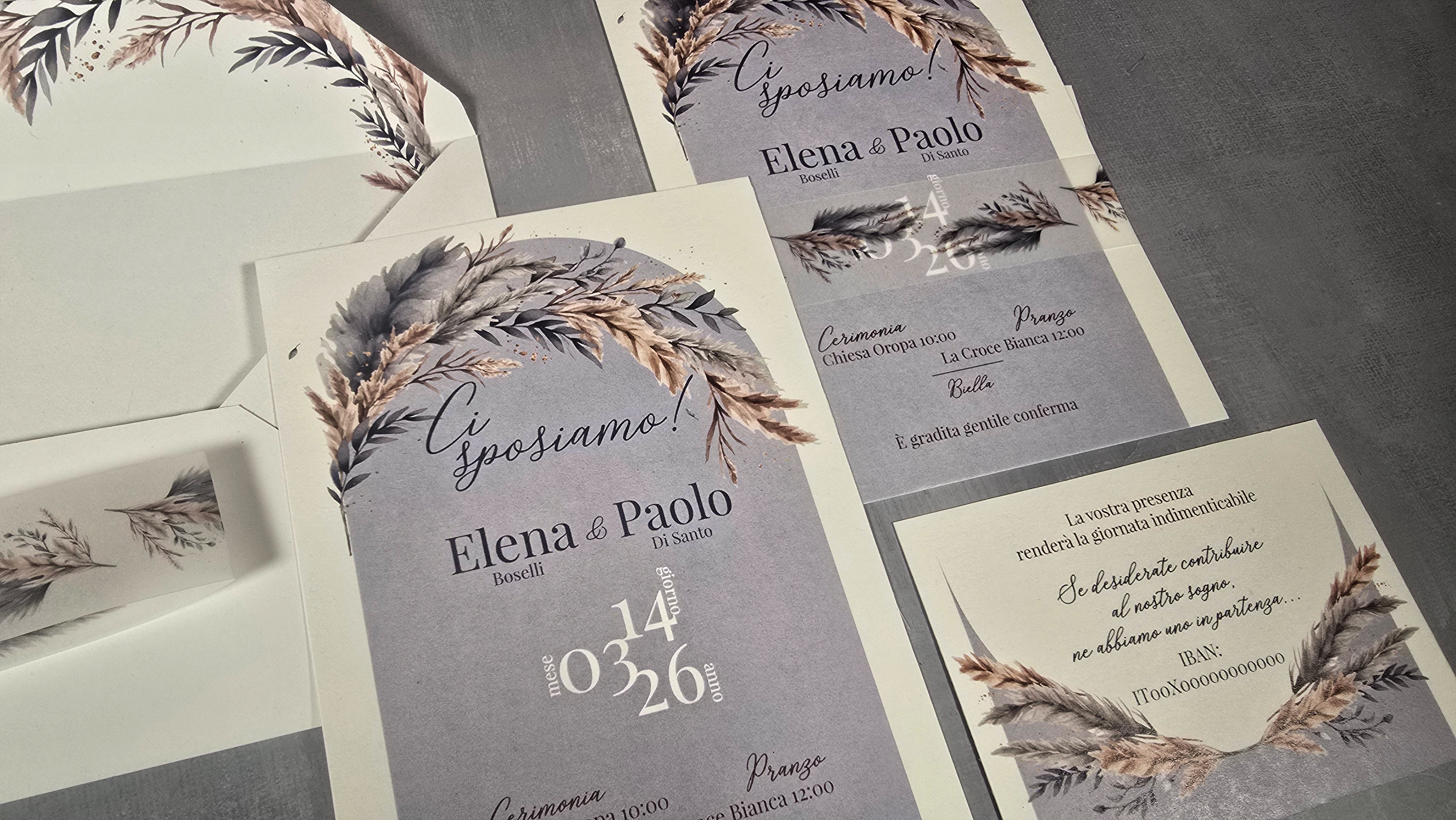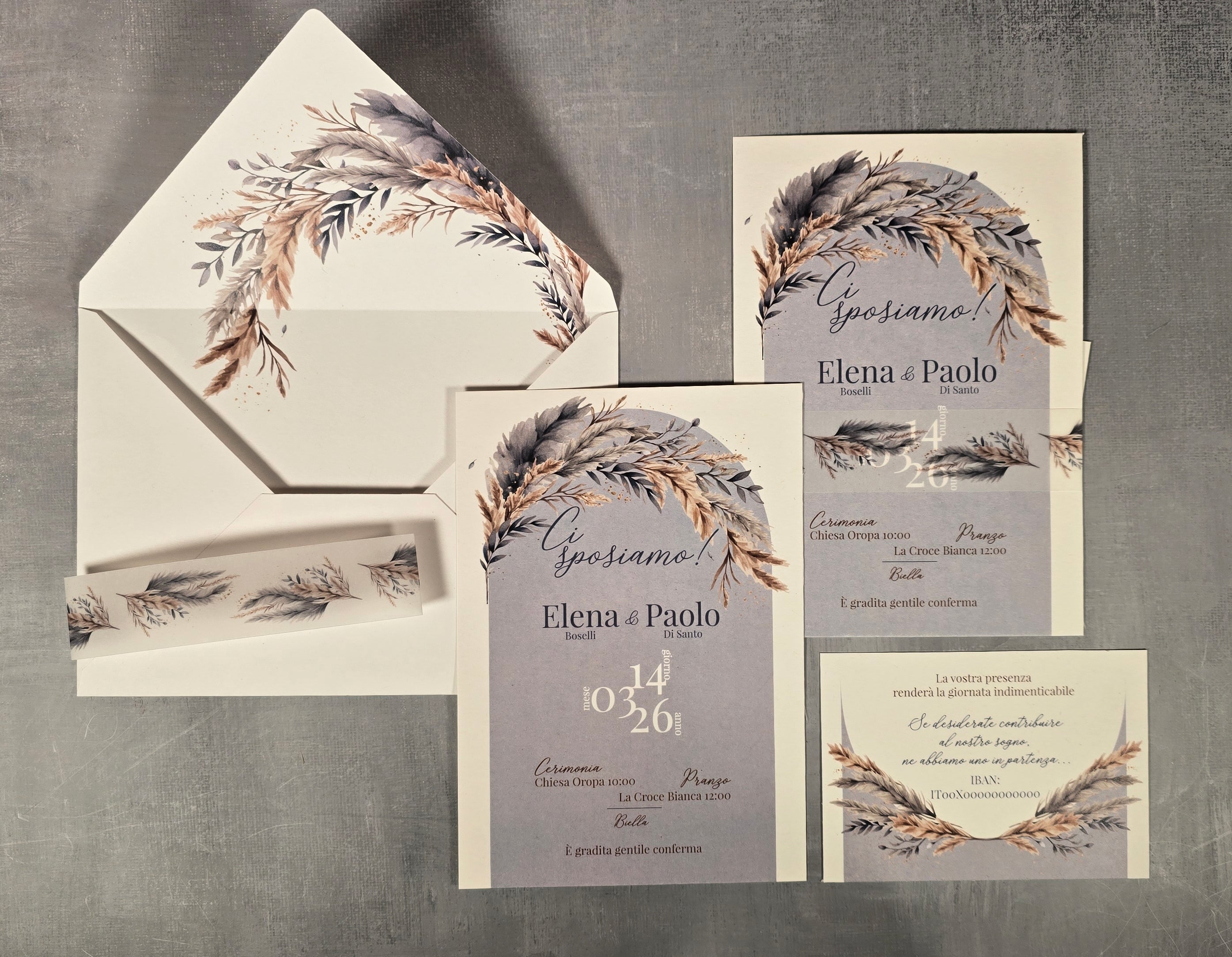 Partecipazione dal design essenziale e raffinato con grafica naturale ispirata a pampas e foliage. Disponibile in una palette di tonalità soft: azzurro tenue, nocciola caldo e crema delicato.