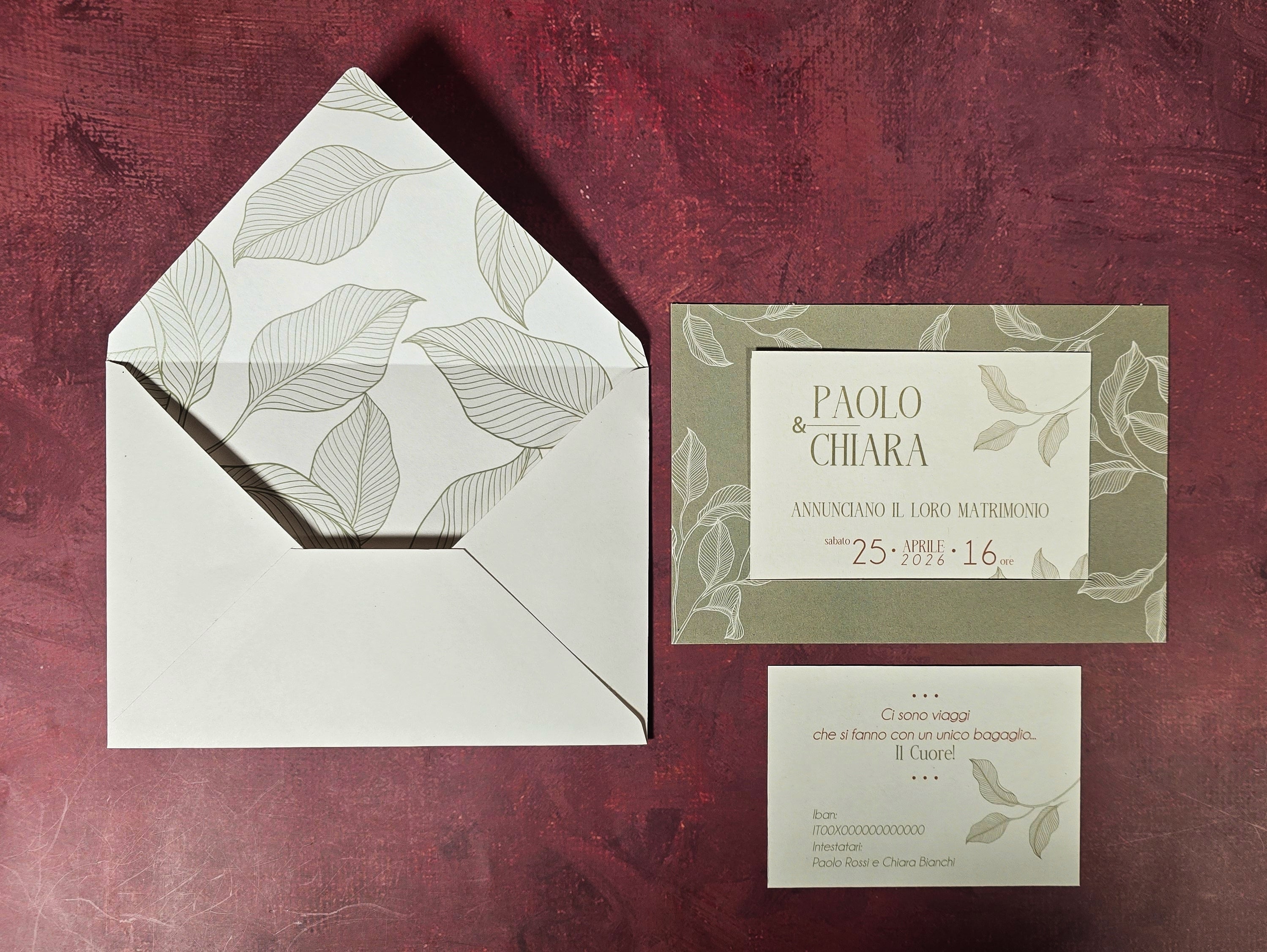 Partecipazione moderna dal design essenziale, caratterizzata da una grafica pulita con foglie stilizzate e un elegante contrasto tra due cartoncini abbinati. La composizione include un cartoncino principale con intaglio orizzontale che mostra al suo interno un secondo cartoncino di colore differente, creando un effetto visivo di grande impatto.