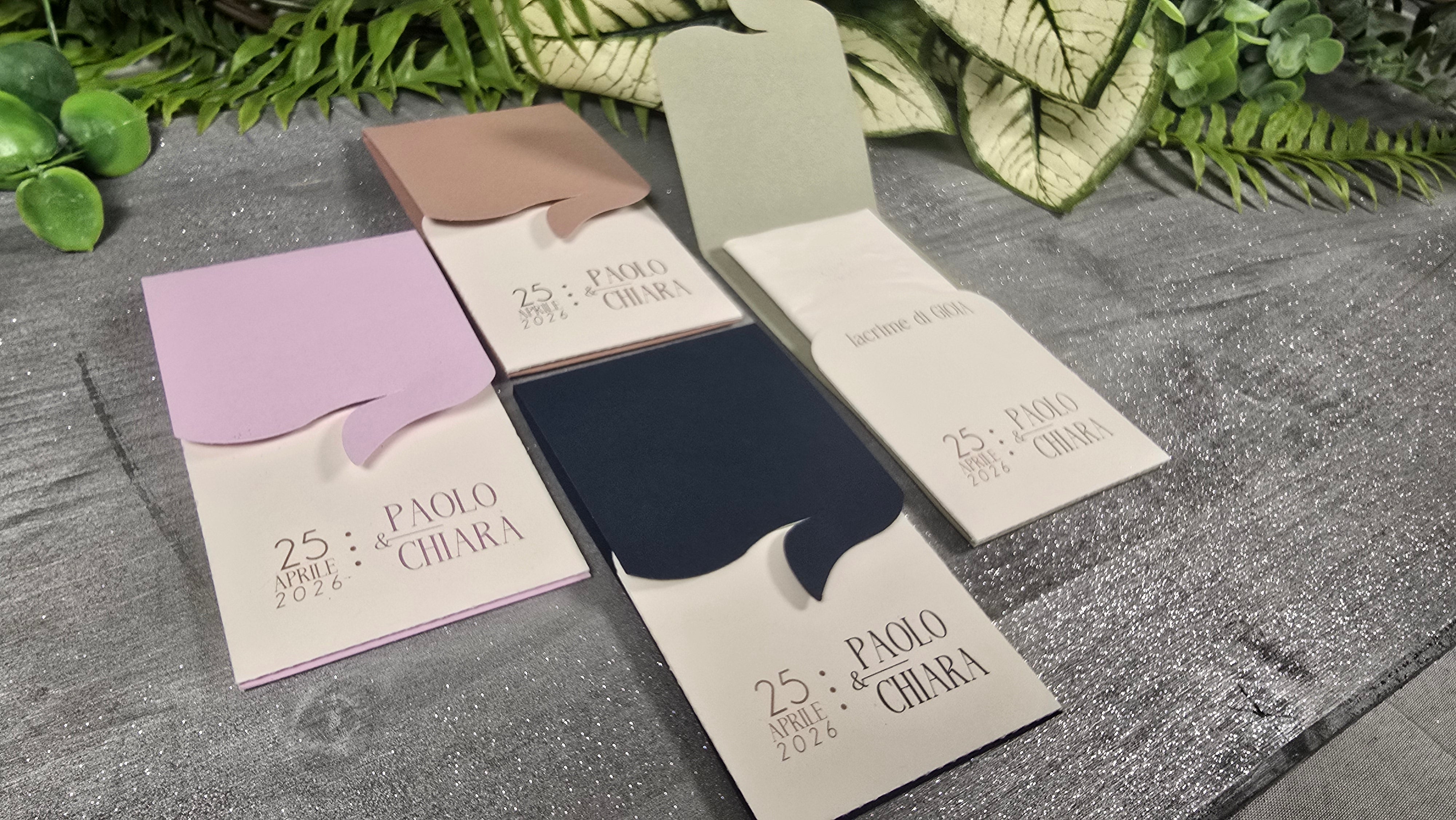 Cogliete l'emozione del momento con il nostro fazzolettino 'Lacrima di Gioia', un delicato compagno per le vostre celebrazioni più toccanti. Ogni fazzolettino è confezionato con cura, pronto per essere offerto agli ospiti come segno di condivisione nelle vostre emozioni più intense. Il gadget perfetto da inserire in una Wedding Bag, oppure da mettere a disposizione agli invitati.