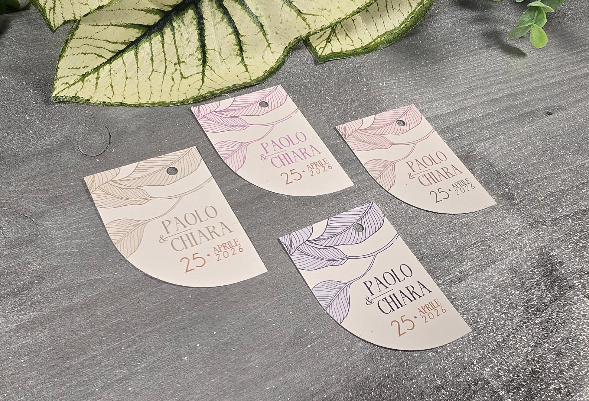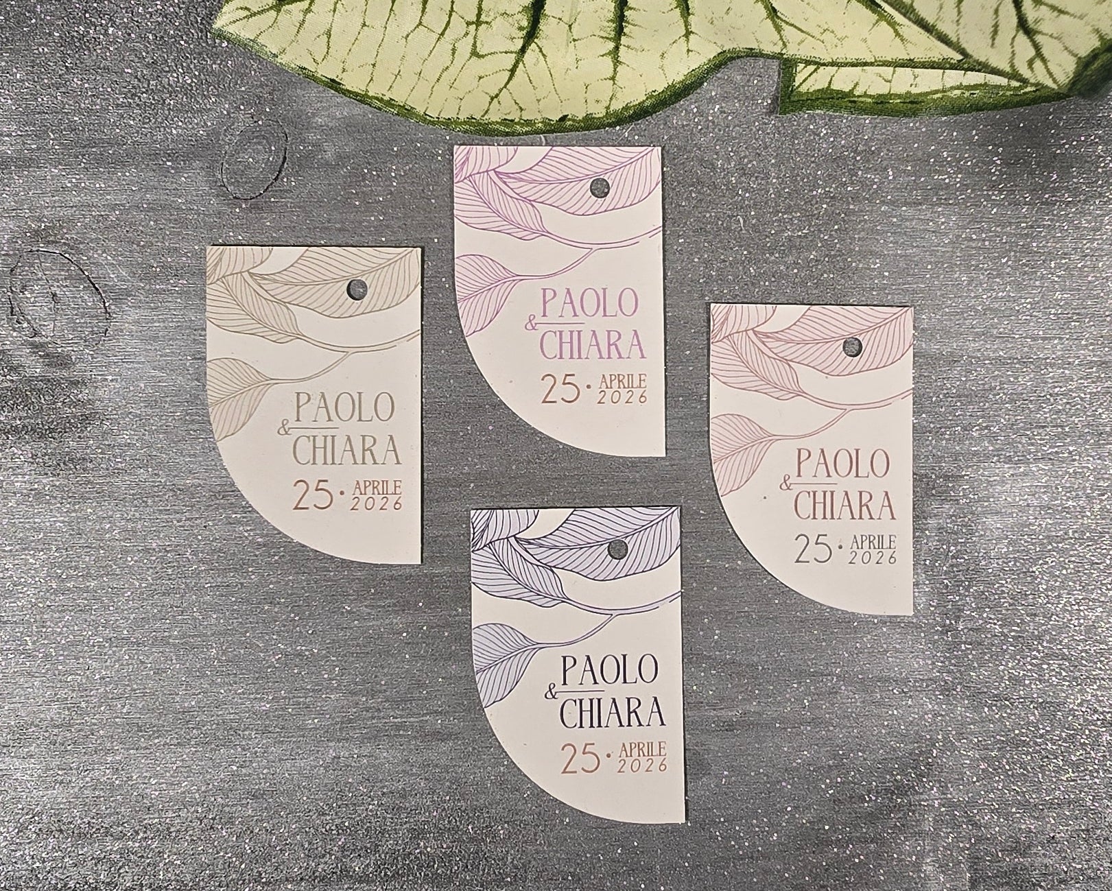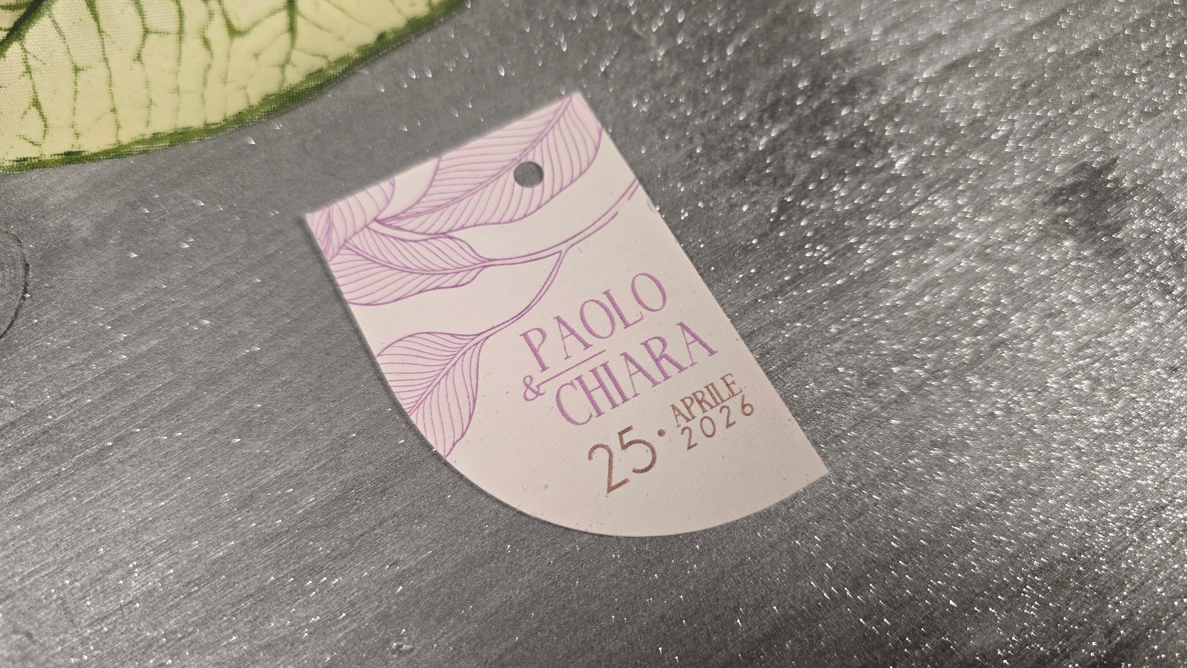 Realizzati con carta di alta qualità e design raffinato, questi tag sono perfetti per accompagnare le vostre bomboniere con stile. Ogni tag può essere personalizzato con il nome degli sposi, rendendo ogni regalo unico e speciale. Il design elegante si abbina perfettamente a qualsiasi tipo di bomboniera, creando un'armonia visiva per la vostra celebrazione.