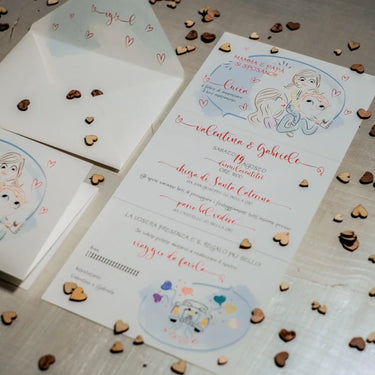 Una partecipazione dedicata a sposi genitori che desiderano coinvolgere nell'organizzazione del loro matrimonio i piccoli di casa.