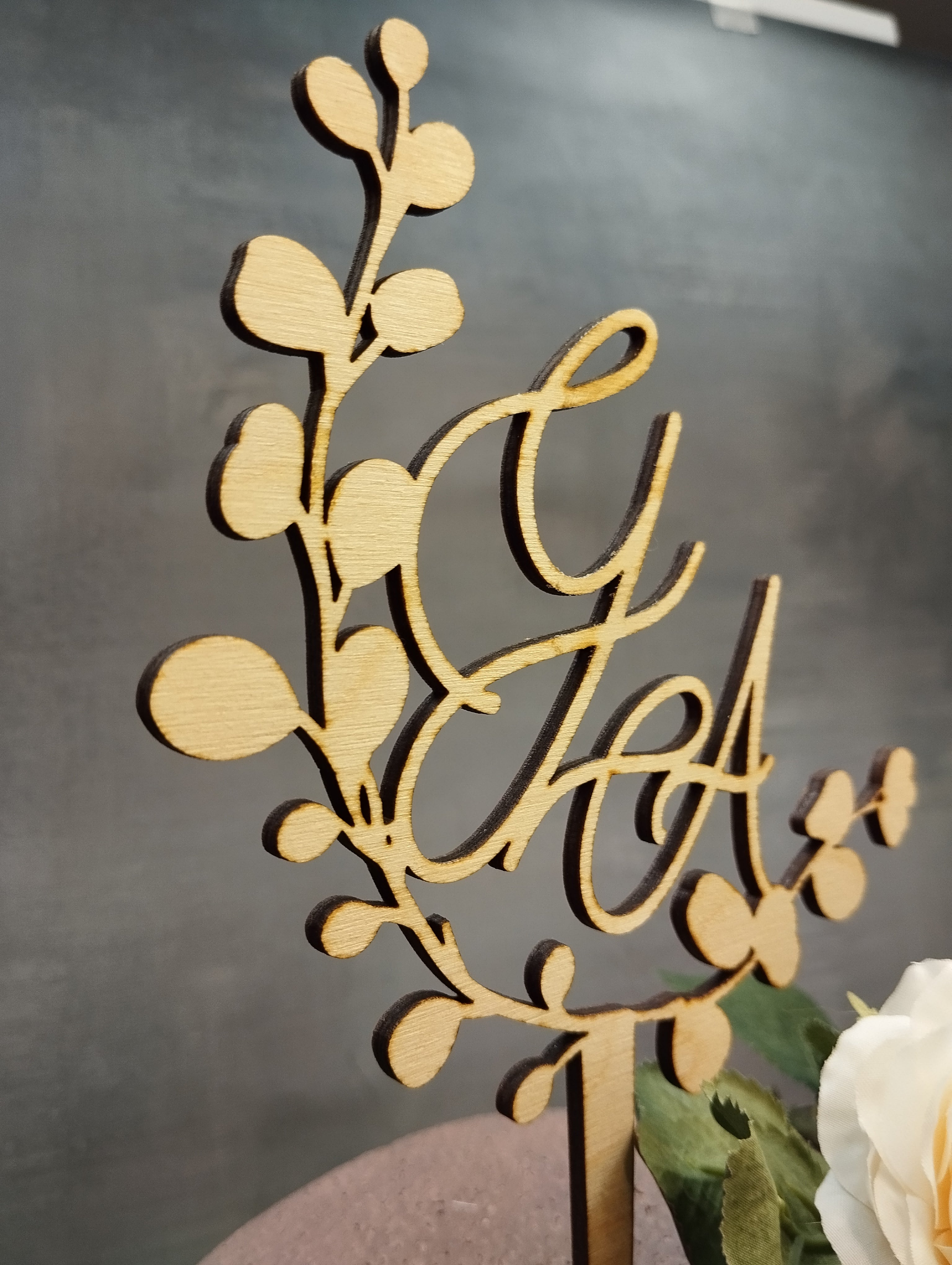 Il cake topper in legno intagliato con foglioline e iniziali degli sposi è un elemento decorativo raffinato, pensato per aggiungere un tocco naturale ed elegante al momento più dolce del vostro matrimonio.