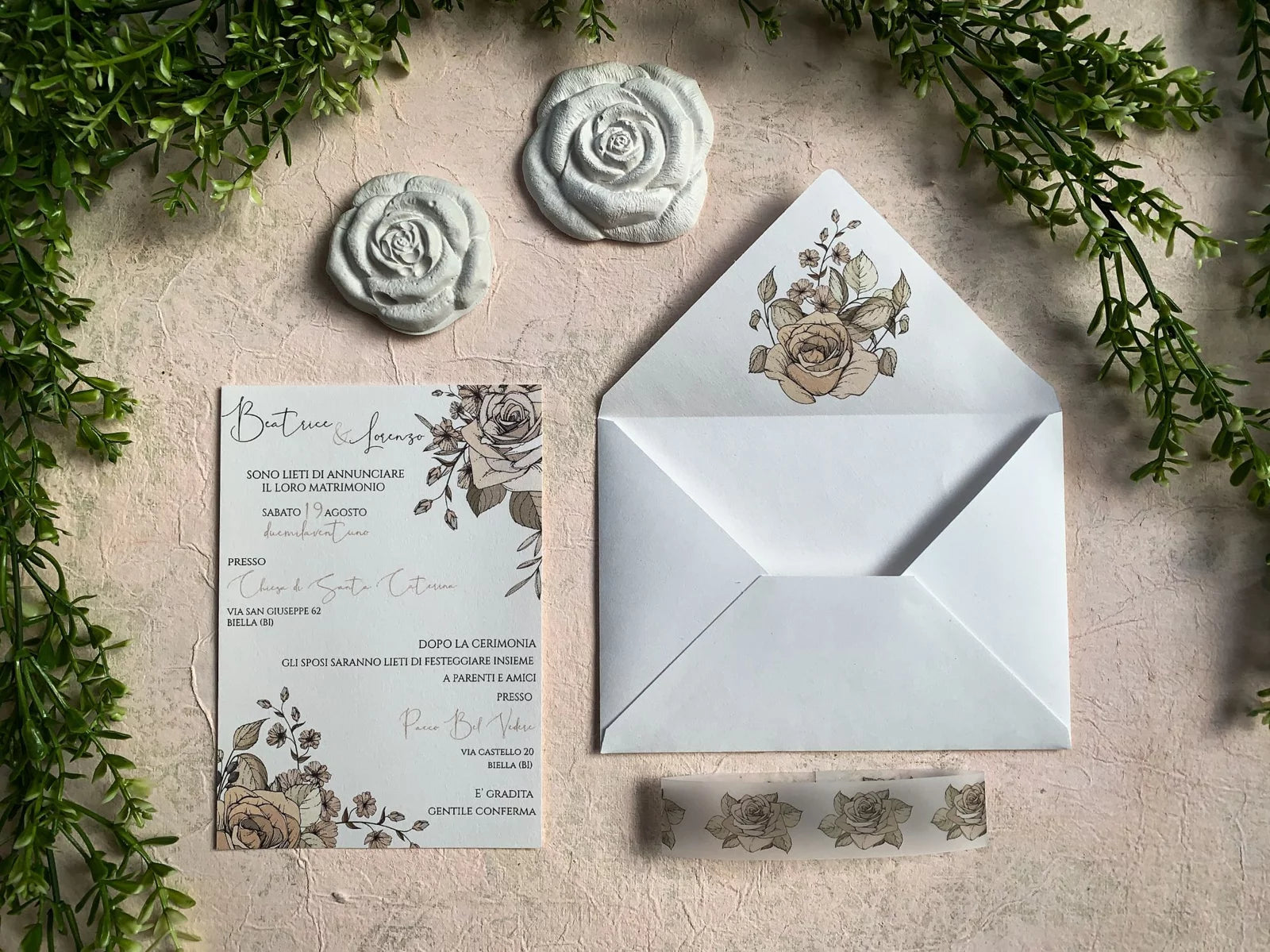Una partecipazione con grafica a disegno con tratto matita, rose cipria, colori neutri. Possibilità di sfumare i fiori in altre tonalità di colore