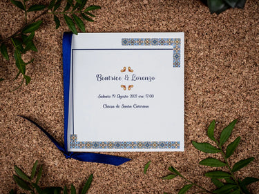 Una linea elegante che richiama la tradizione italiana delle maioliche stampate. Maioliche in tonalità blu e giallo che possono anche essere modificate con altri colori. Moderna, e ricercata la partecipazione è realizzata con una ceramica stampata che diventerà un regalo per gli ospiti