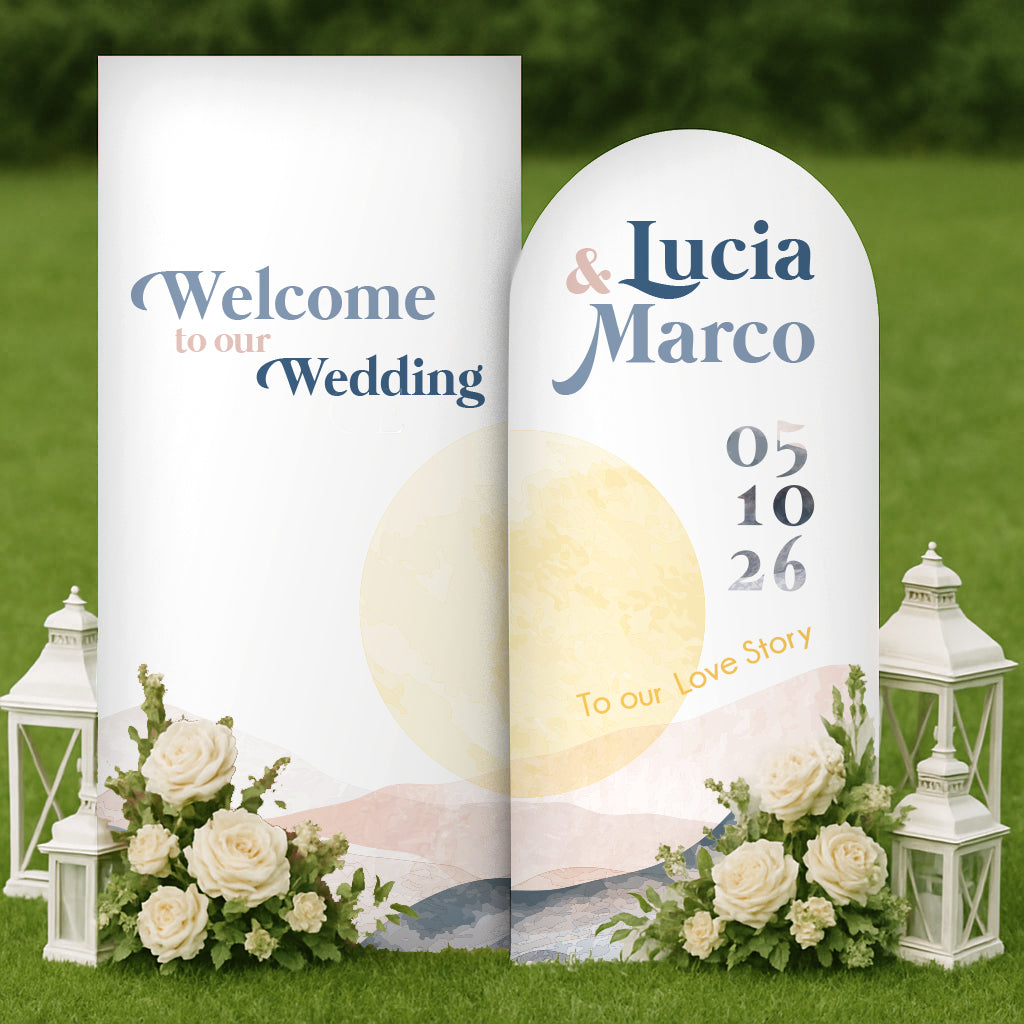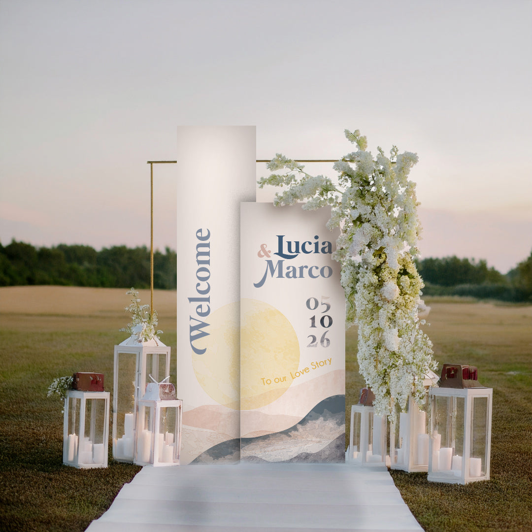 Accogli i tuoi ospiti con pannelli coordinati allo stile Twilight, ispirato alla magia del tramonto: un momento sospeso tra luce e notte, simbolo di un nuovo inizio. La palette si muove tra toni pastello morbidi e avvolgenti, perfetti sia per matrimoni estivi all’aperto che per ricevimenti invernali in ambienti eleganti. Lo stile minimalista e raffinato, con linee sottili, tipografie moderne ed elementi grafici essenziali, dona a ogni pannello un’eleganza senza tempo. Ogni dettaglio è studiato per accompagnare l’evento con discrezione e personalità, valorizzando la luce e i materiali.