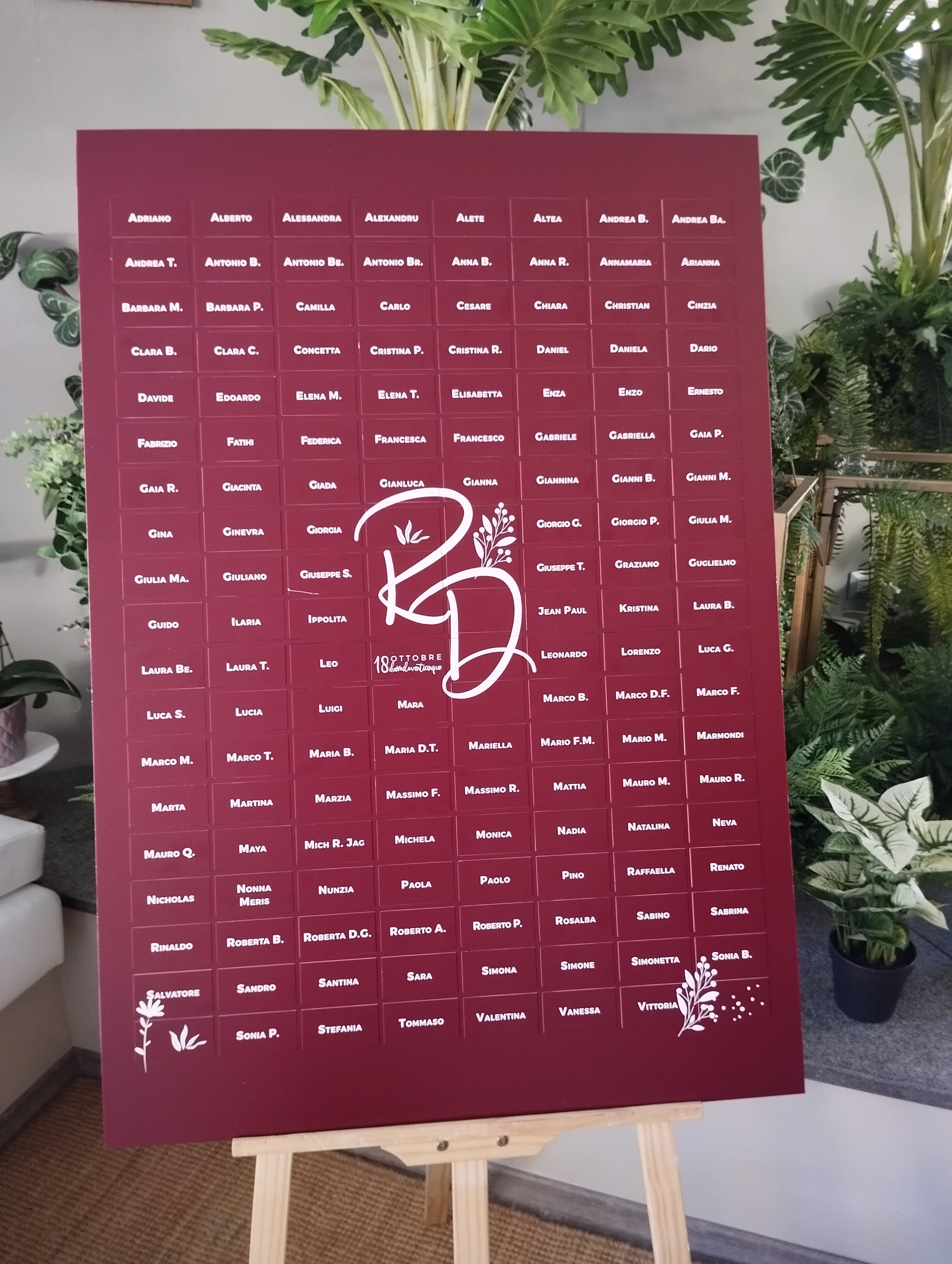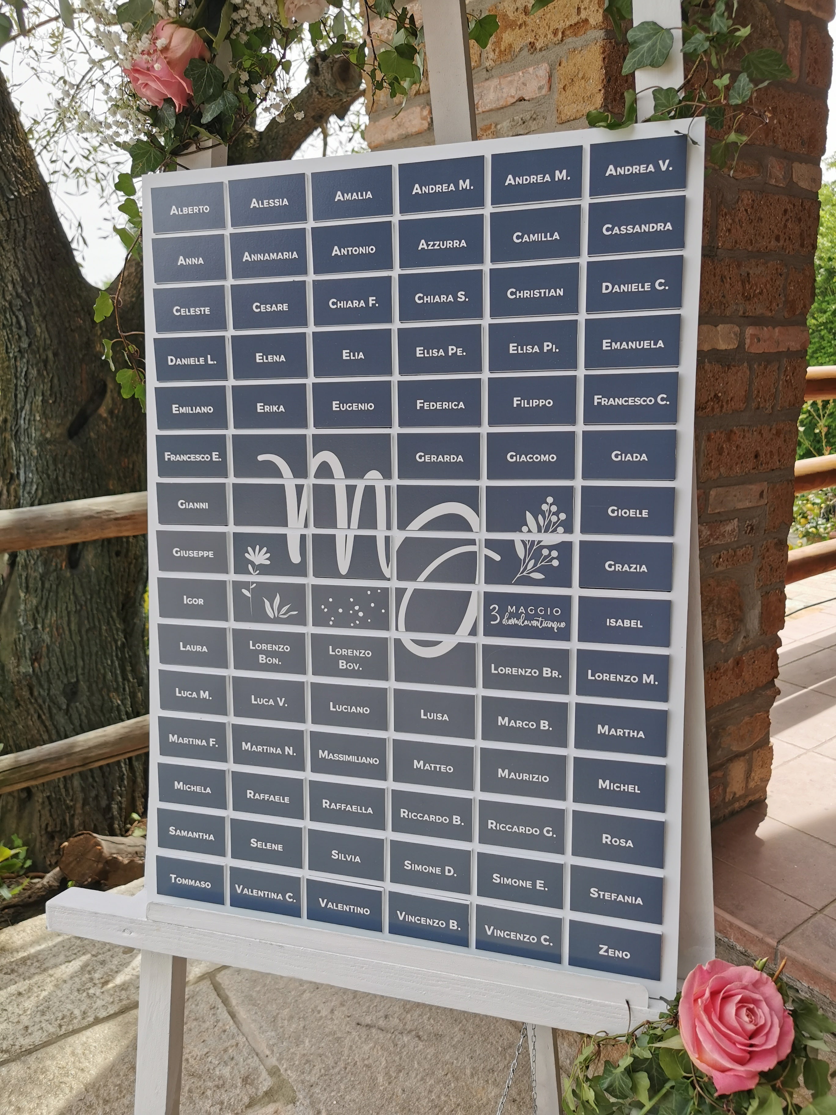 Rinunciando a data e/o iniziali sul fronte è possibile aggiungere +15 tasselli alla capacità base. Per oltre 152 ospiti, realizziamo tableau su misura. Scrivici a shop@stampaecrea.it indicando il numero di invitati.
