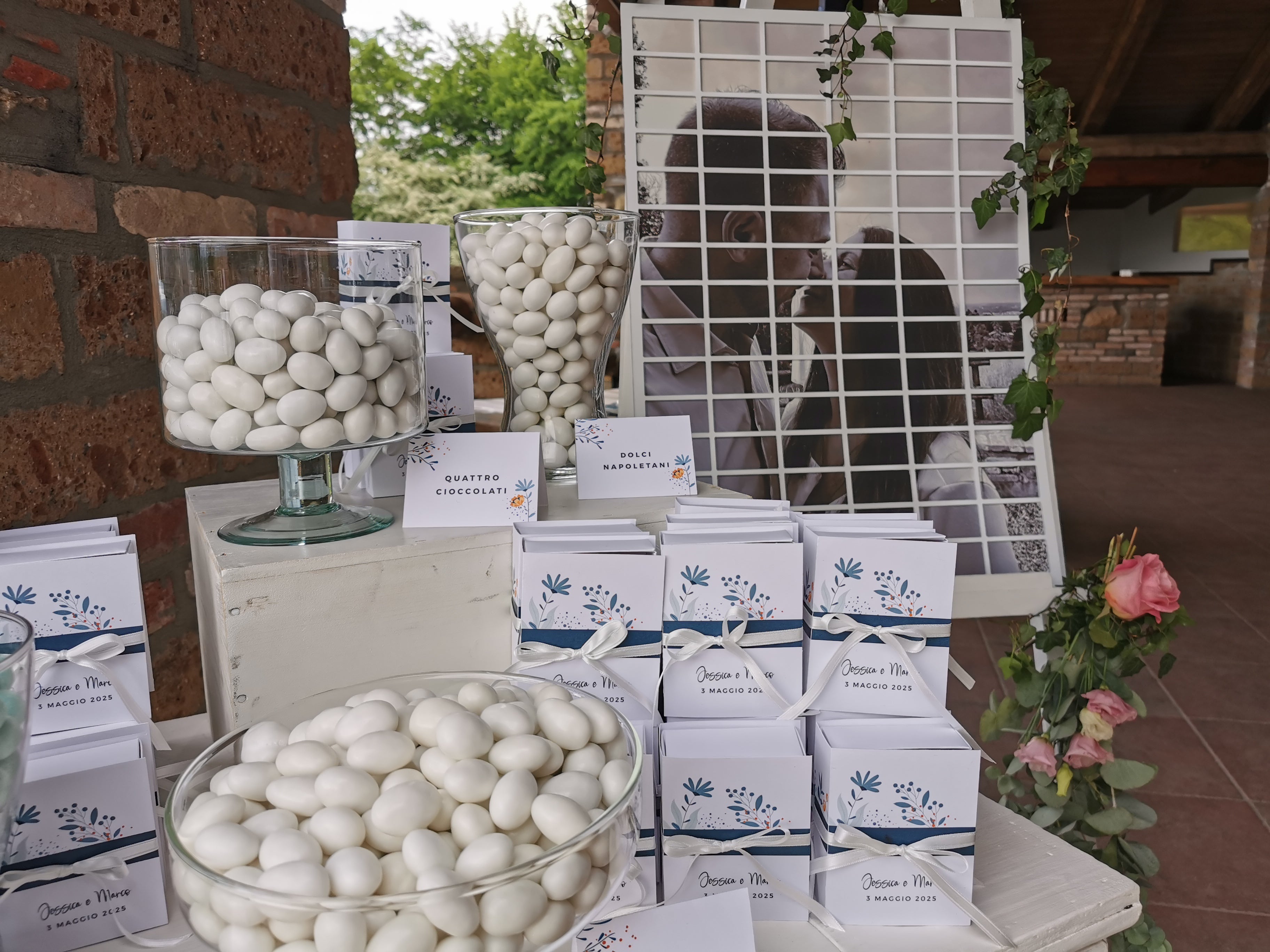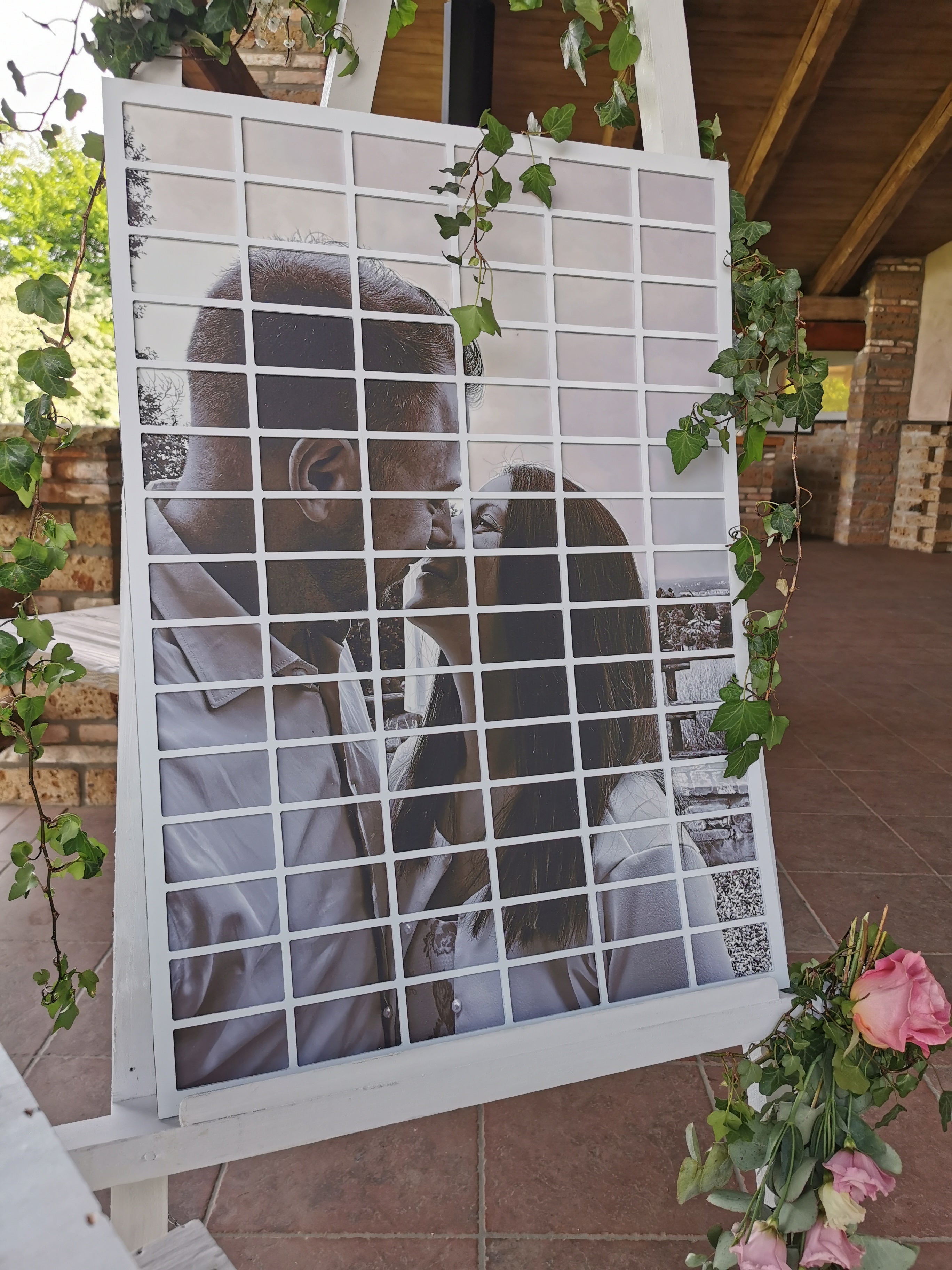 Il pannello, stampato con la gigantografia degli sposi, contiene dei tasselli estraibili perfettamente integrati nella grafica.