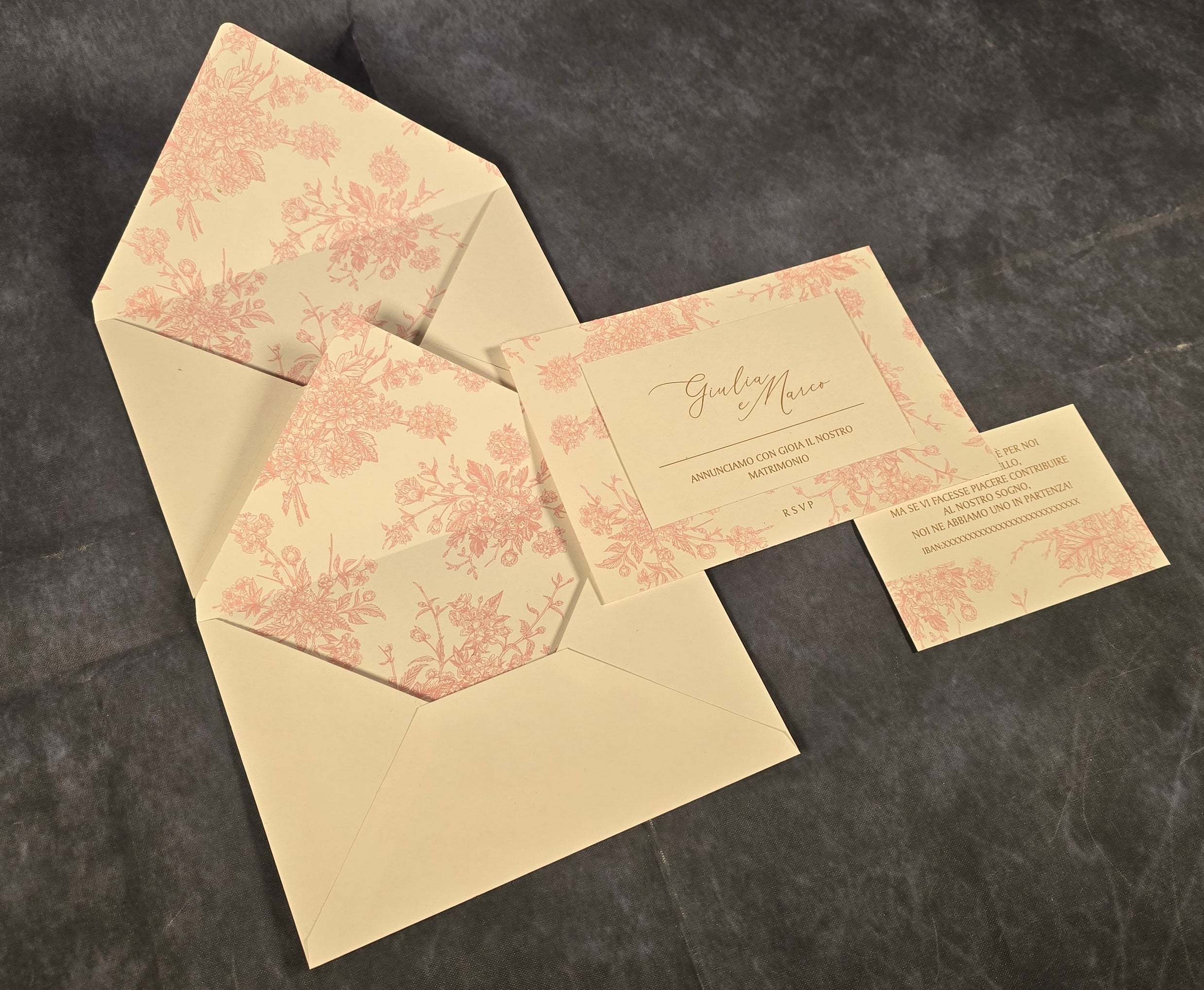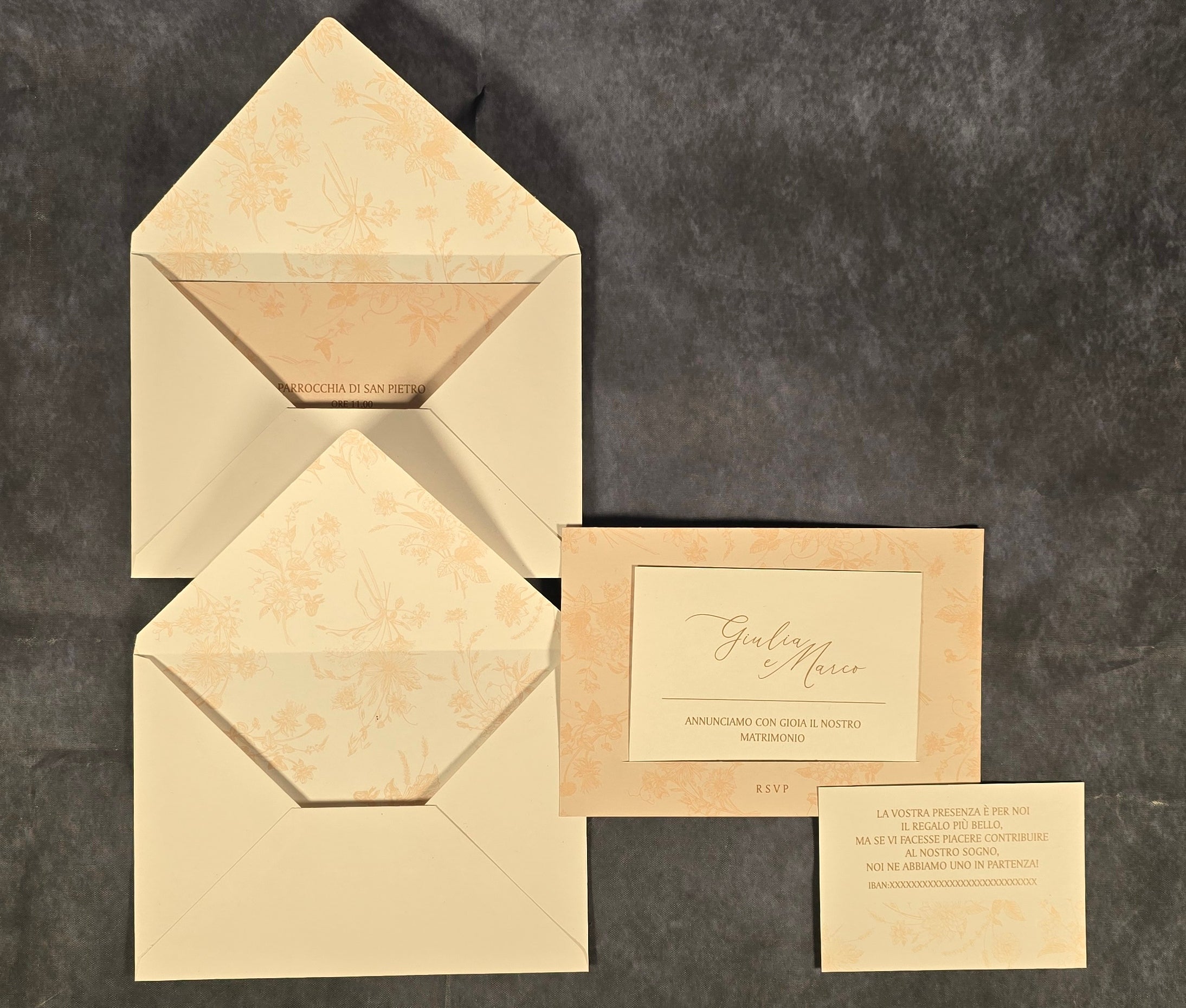 Formato partecipazione semplice ma raffinato, in eleganti toni pastello (pesca, verde salvia, azzurro polvere, bianco e rosa polvere). Pattern arabesque e floreale delicato per un'estetica armoniosa. È possibile completare il servizio con gli elementi coordinati della linea Charme Arabesque.