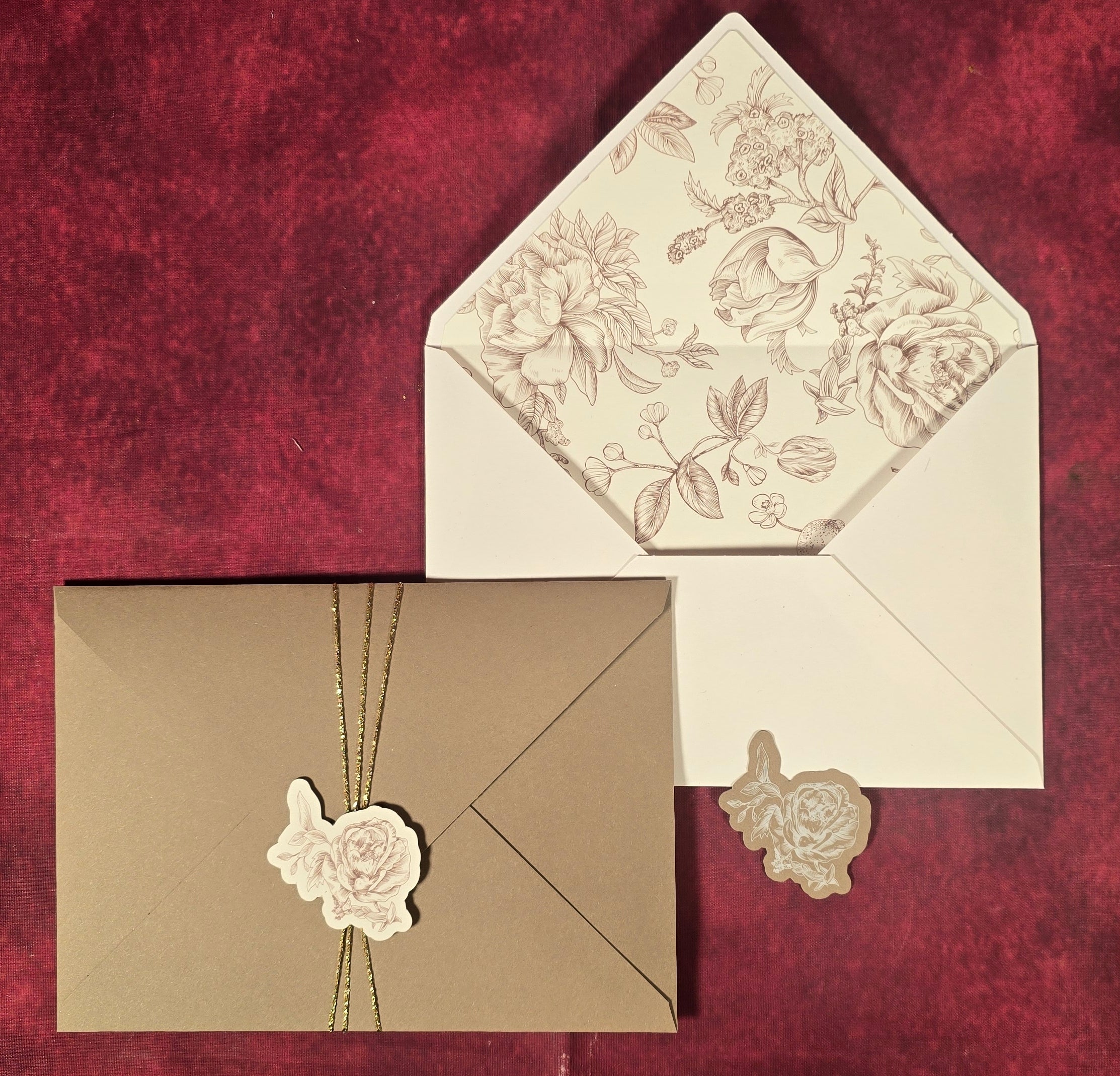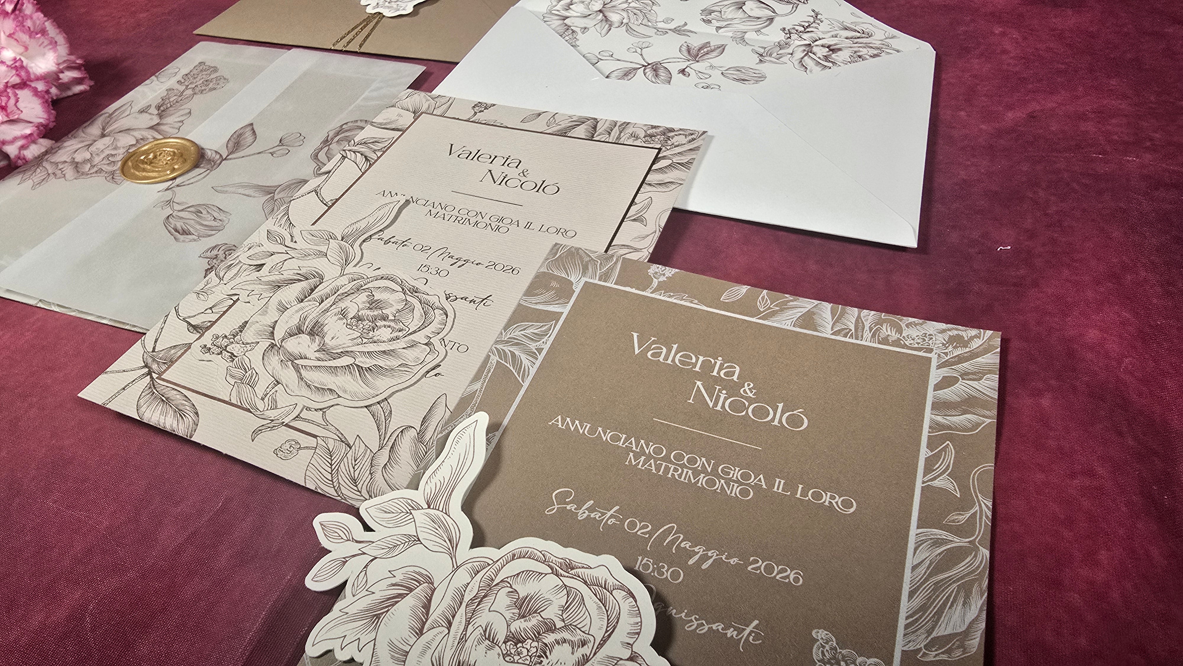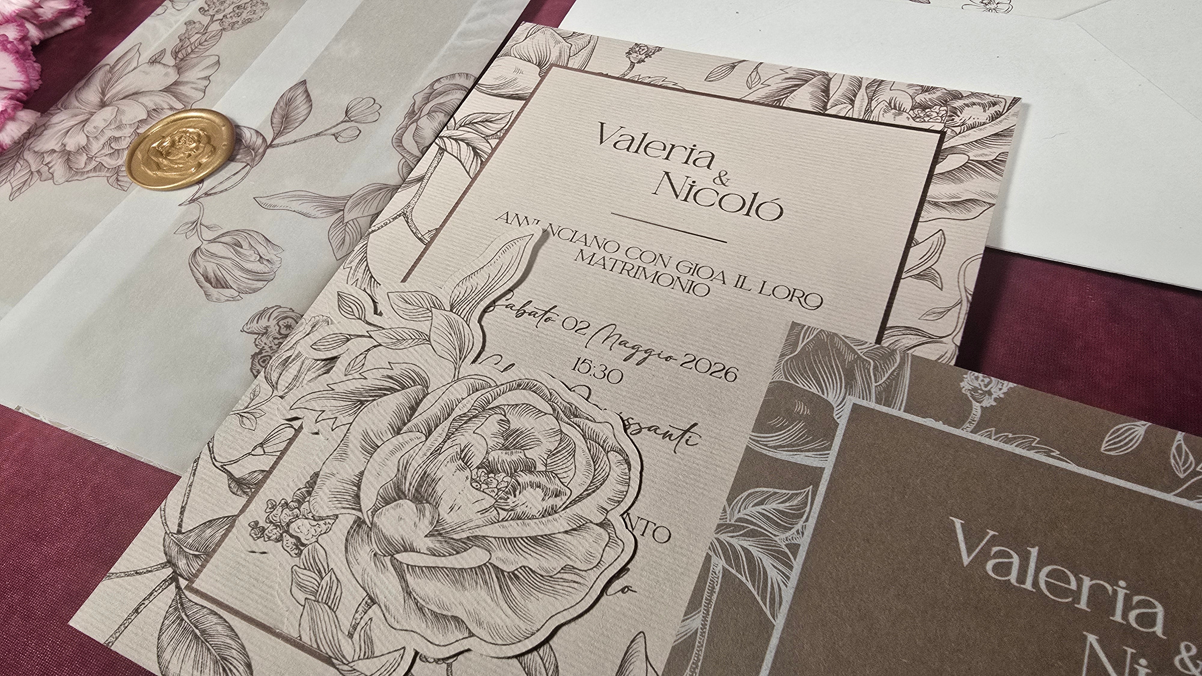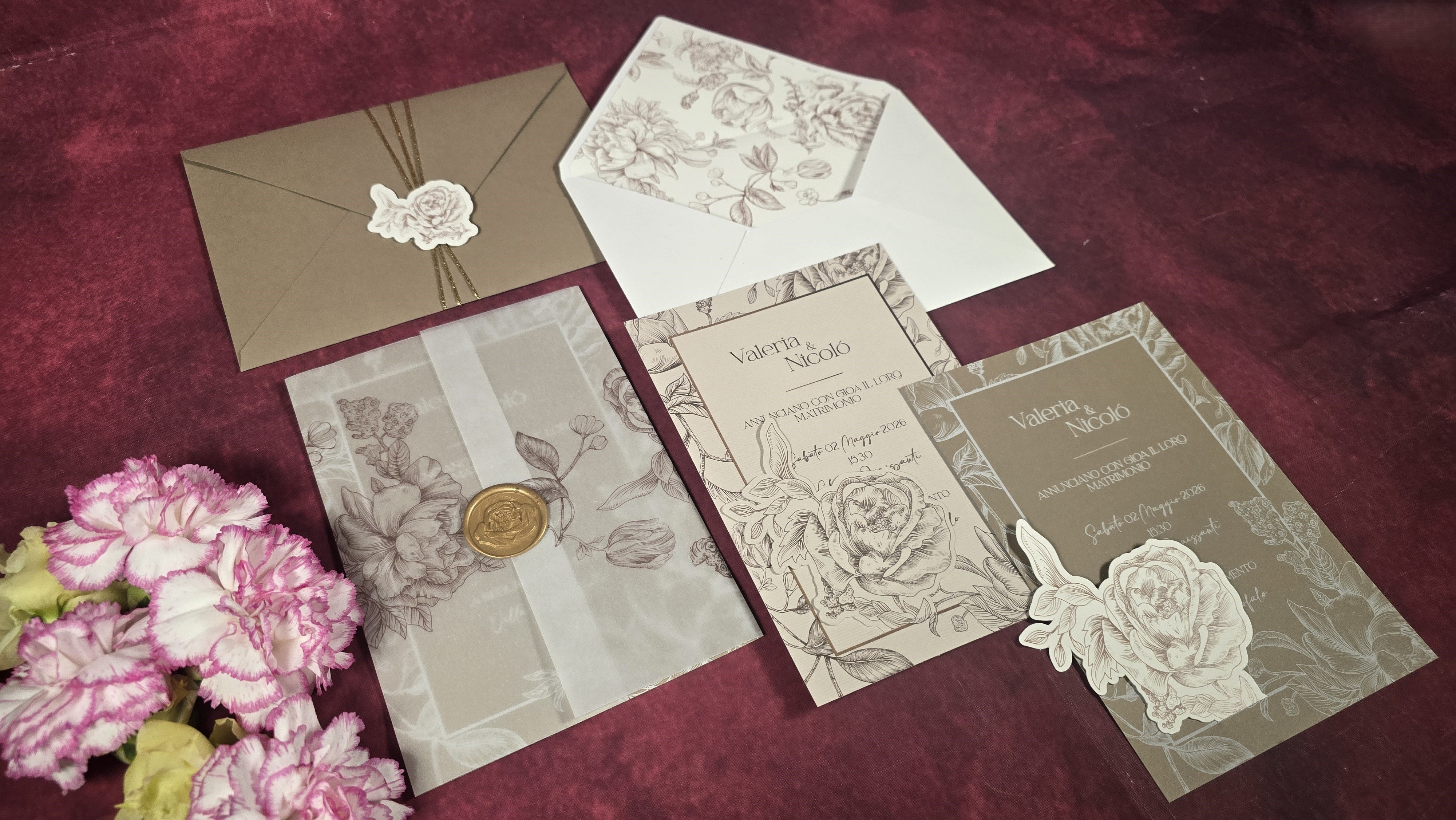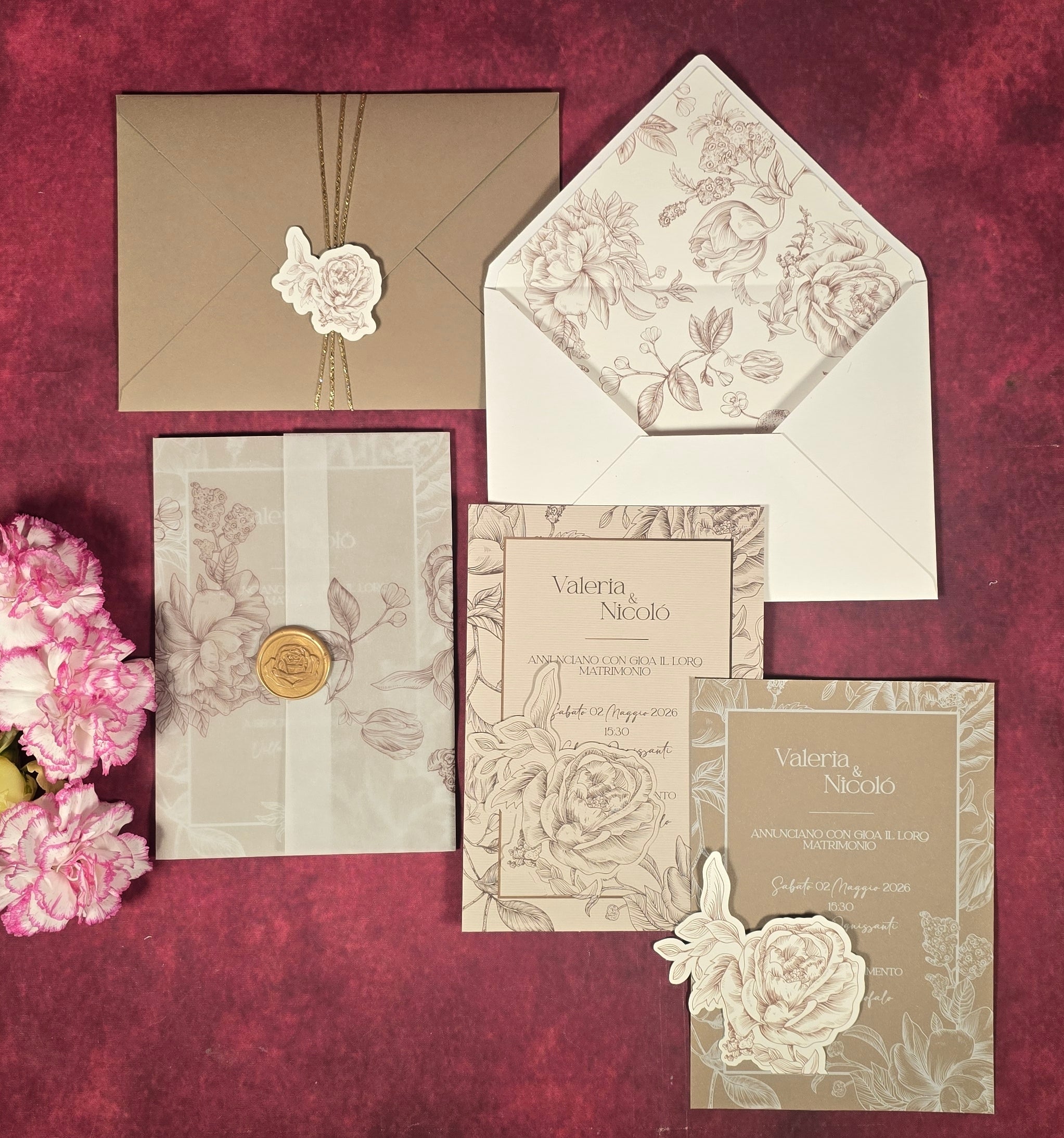 A racchiudere il tutto, un folder esterno in carta semitrasparente con stampa floreale, chiuso da un elegante sigillo in ceralacca. Completano il coordinato una busta abbinata e, per chi cerca un dettaglio in più, la fodera interna con stampa a fiore, arricchita da una chiusura con cordino dorato e fiore intagliato a contrasto.