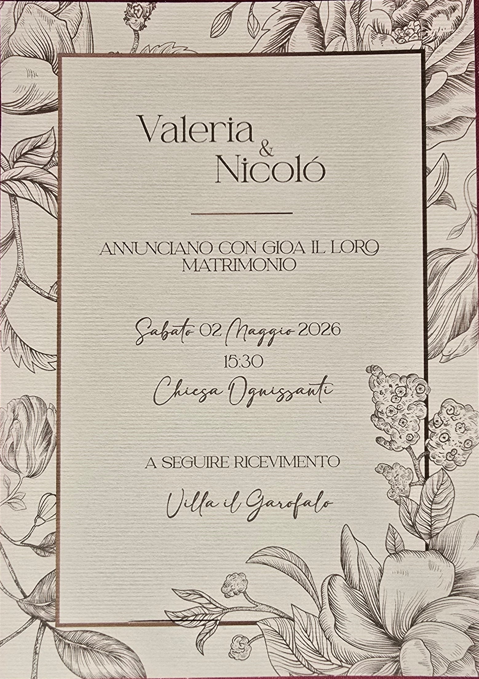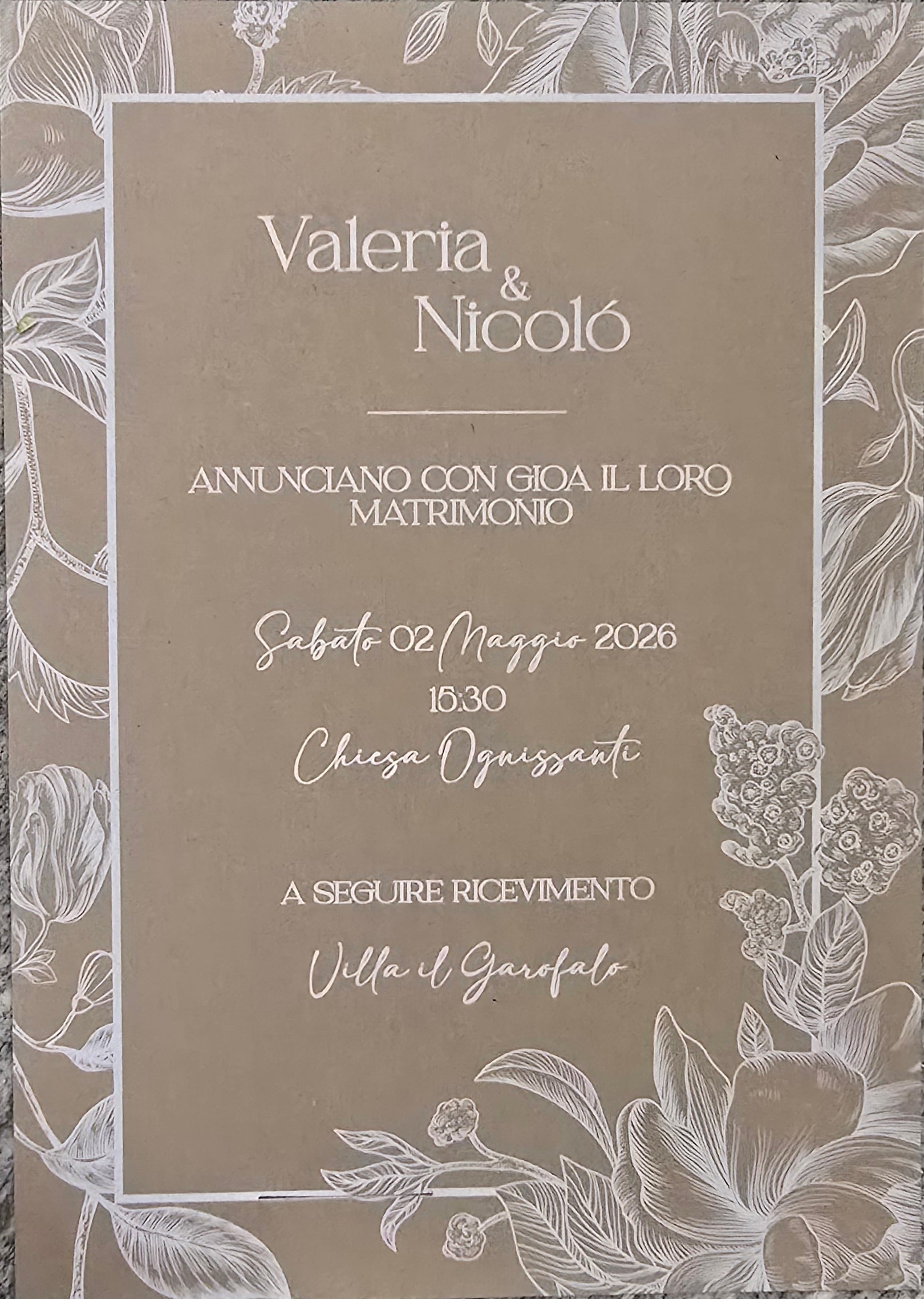 Tutte le nostre partecipazioni e inviti, sono progettati per rendere i vostri eventi speciali ancora più memorabili. Celebrate il vostro evento speciale con stile e raffinatezza. Scegliete le nostre partecipazioni e lasciate che il vostro evento sia un'esperienza indimenticabile per tutti gli ospiti.