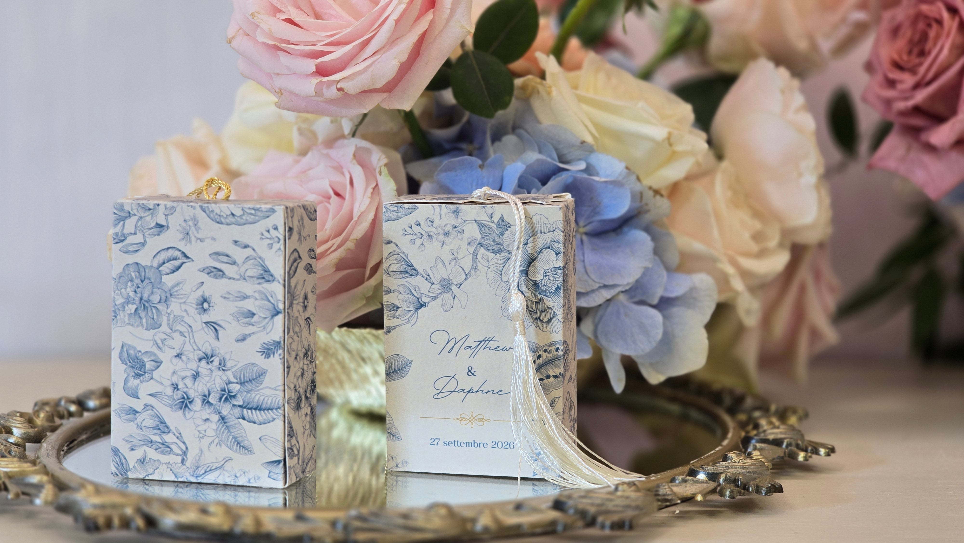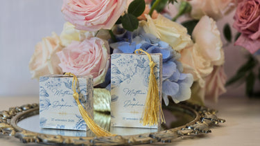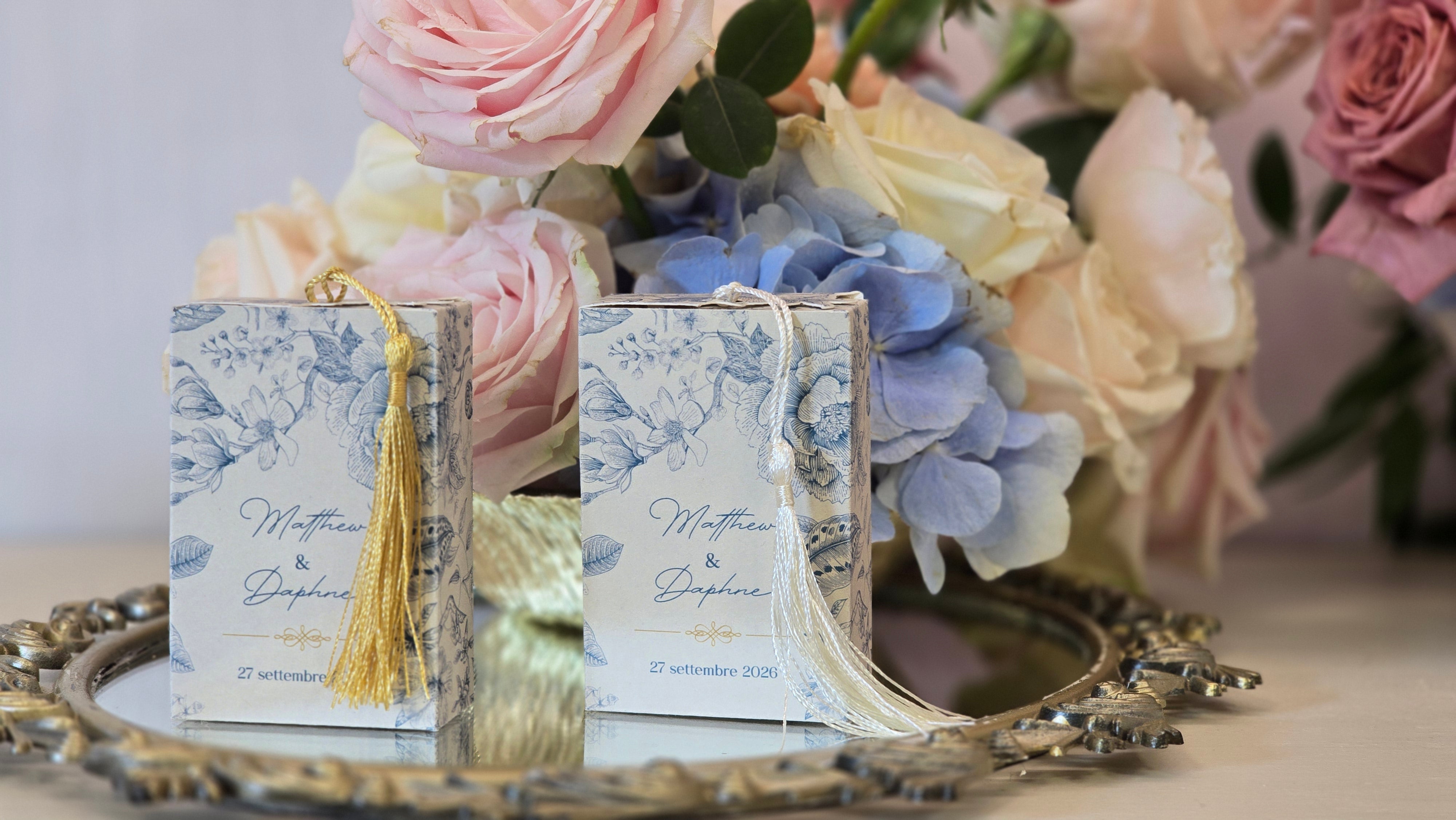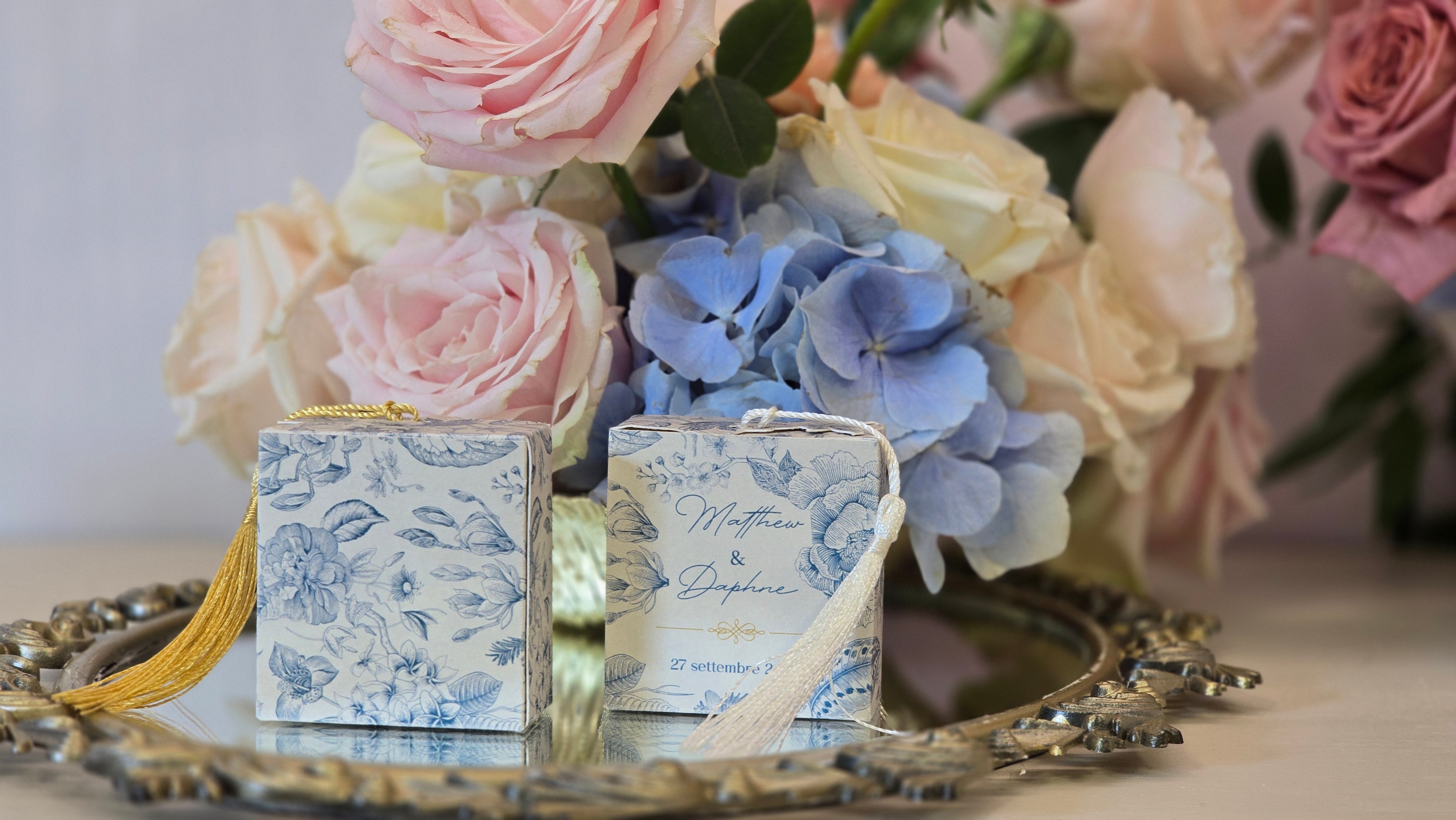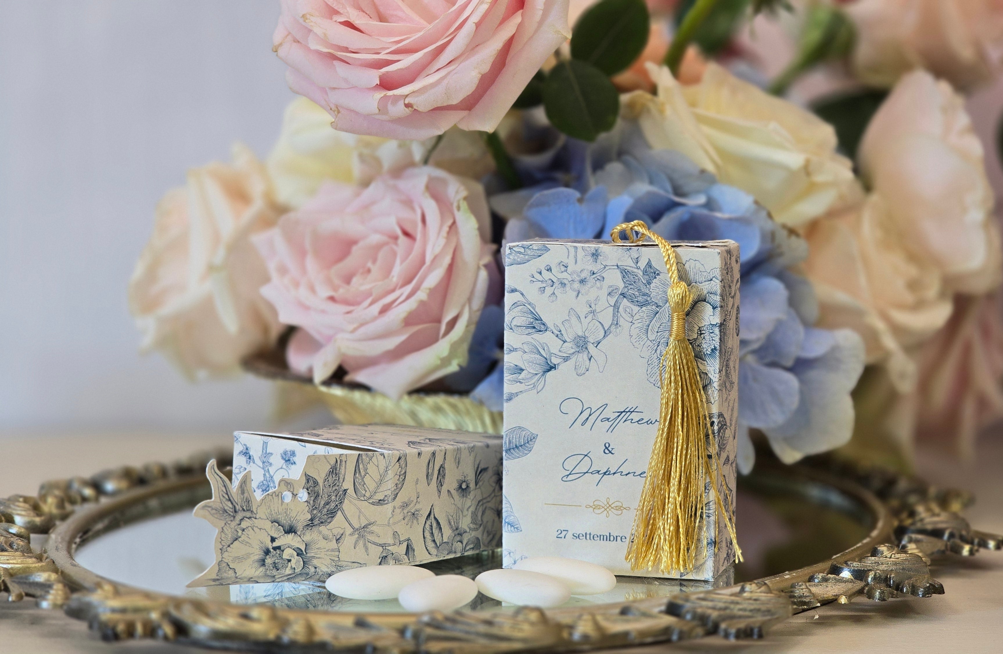 Personalizzabile secondo il vostro tema e i vostri colori, la scatolina diventa un dettaglio unico e memorabile per il vostro matrimonio o evento.