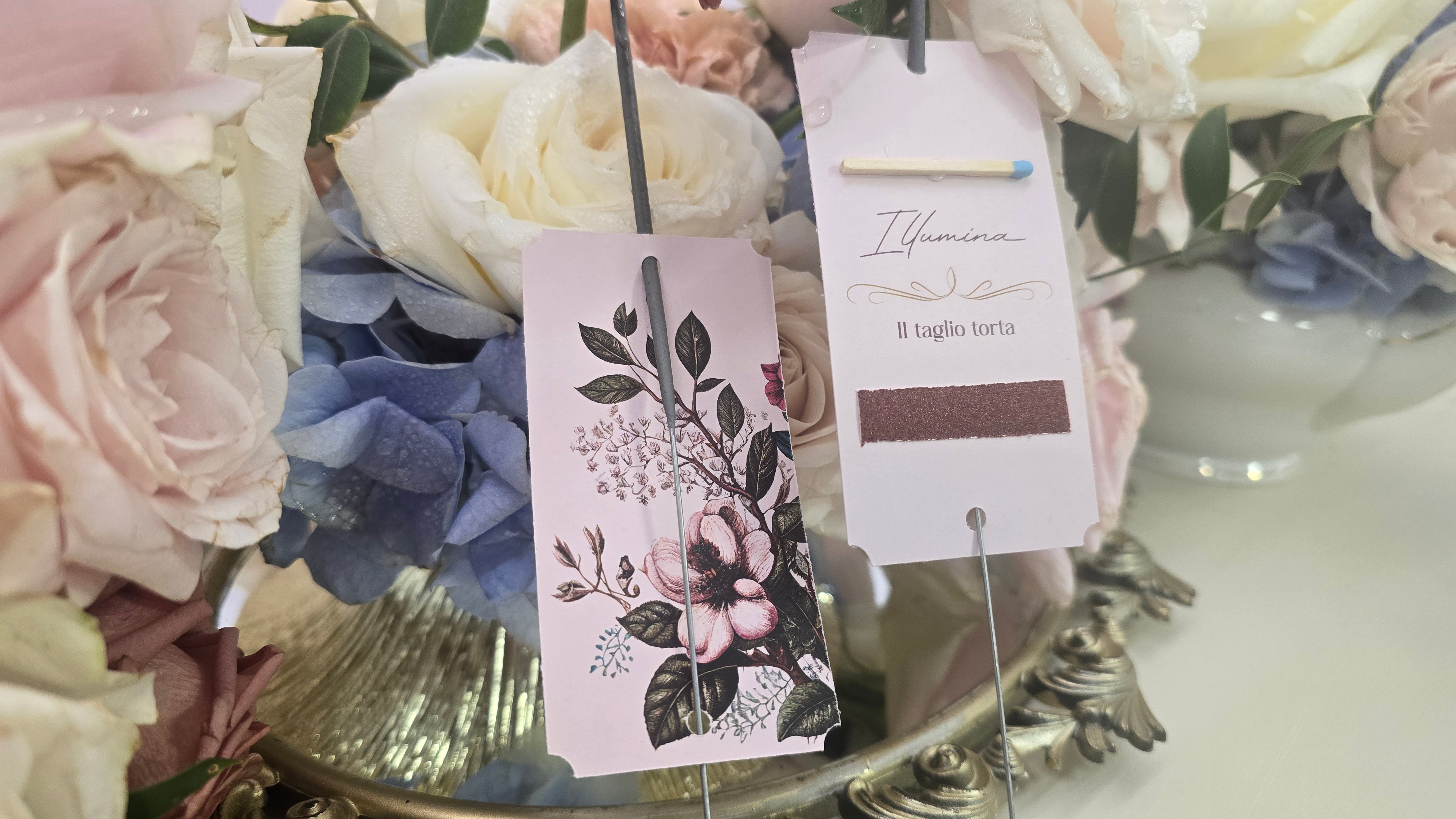 Cartoncino per scintillina da taglio torta in elegante stile Regency. Misura 5x10 cm e presenta un raffinato design floreale sul retro. La parte frontale è interamente personalizzabile con una frase a scelta, iniziali e data della vostra celebrazione. Completa la confezione la possibilità di aggiungere il pratico cartoncino di fiammifero e la strip di accensione. Un dettaglio magico e personalizzabile per rendere indimenticabile il momento del taglio della torta.